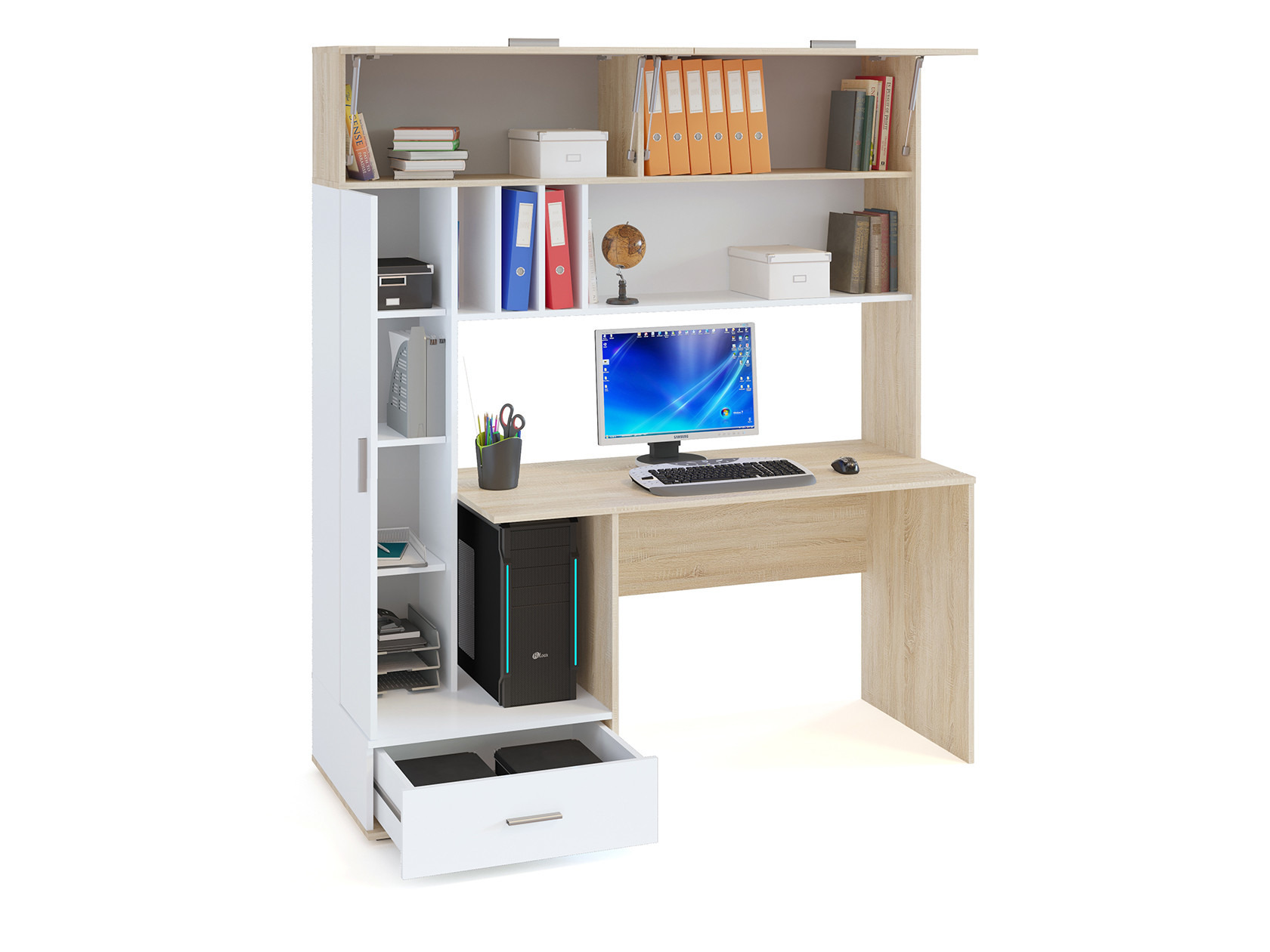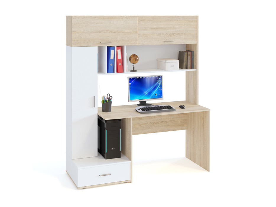 Над столешницей расположена надстройка с полочками, а также двумя закрытыми отделениями, дверцы которых поднимаются при помощи газлифтов. К надстройке примыкает стеллаж с распашной дверцей, за которой скрыты 3 полки. Под столешницей расположена ниша под системный блок, а также выдвижной ящик на шариковых направляющих.