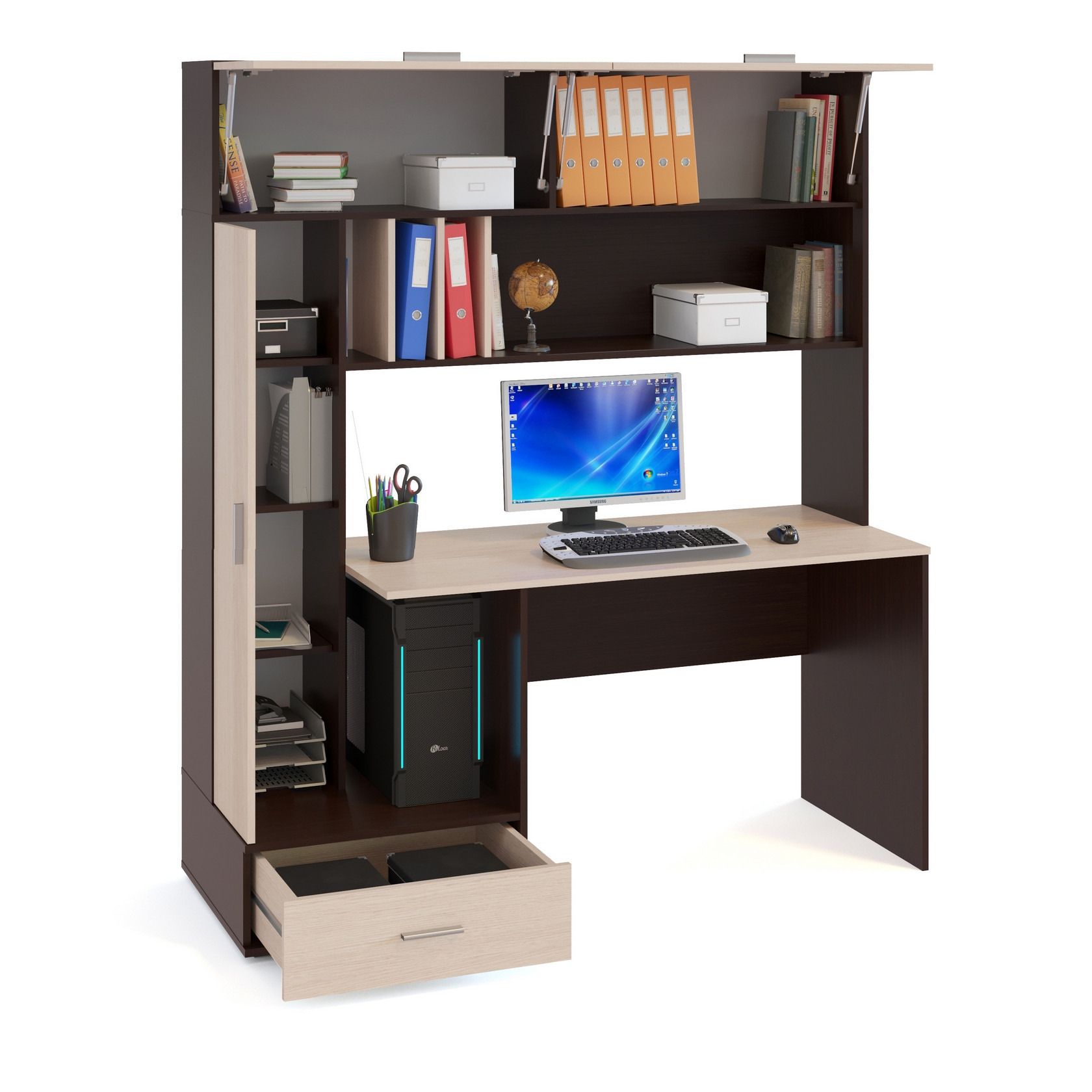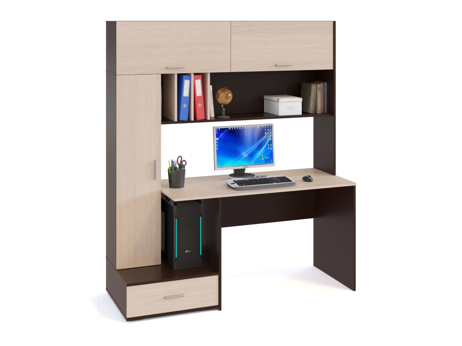 Над столешницей расположена надстройка с полочками, а также двумя закрытыми отделениями, дверцы которых поднимаются при помощи газлифтов. К надстройке примыкает стеллаж с распашной дверцей, за которой скрыты 3 полки. Под столешницей расположена ниша под системный блок, а также выдвижной ящик на шариковых направляющих.