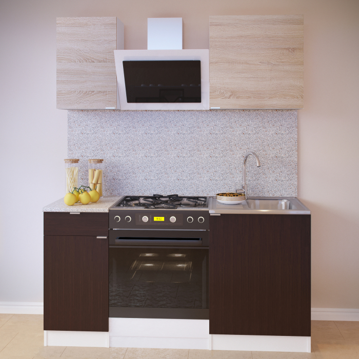 Ширина гарнитура с учетом установки плиты и вытяжки — 1600 мм.