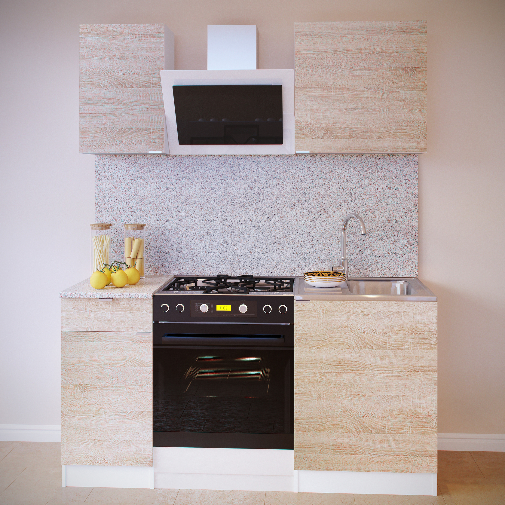 Ширина гарнитура с учетом установки плиты и вытяжки — 1600 мм.