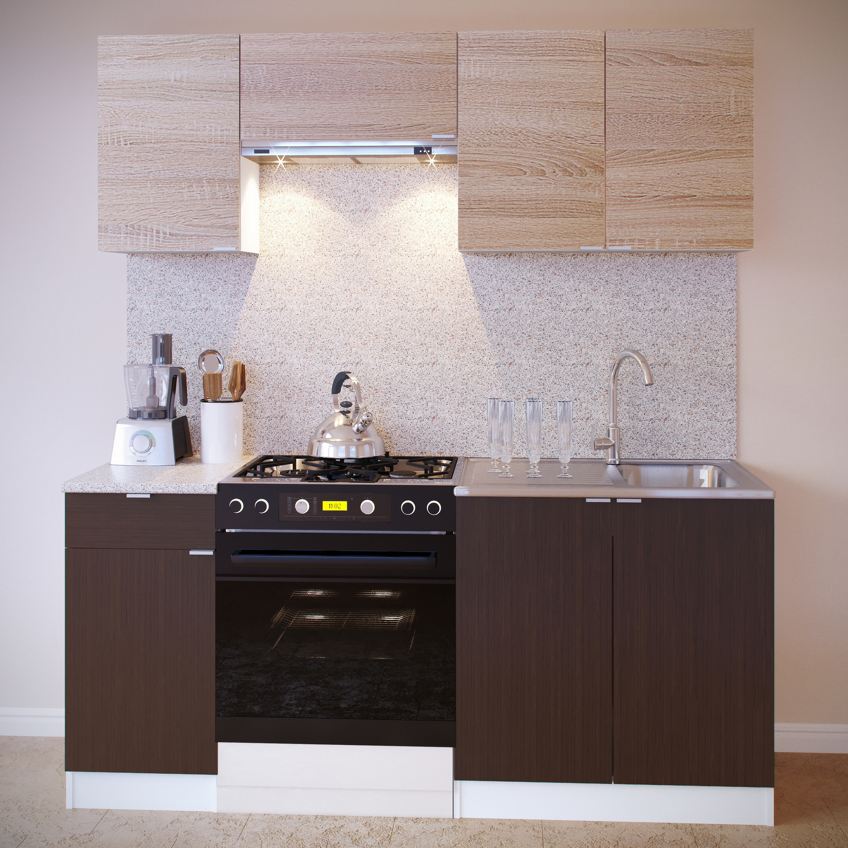 Ширина гарнитура с учетом установки плиты и вытяжки — 1800 мм.