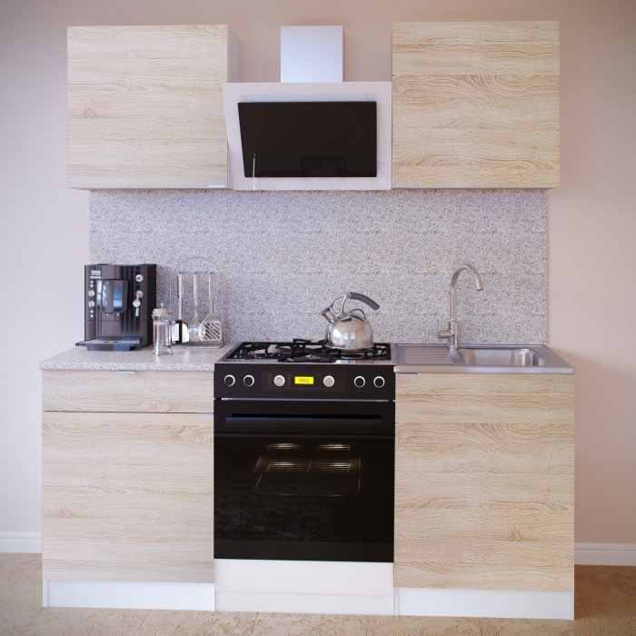 Ширина гарнитура с учетом установки плиты и вытяжки — 1600 мм.