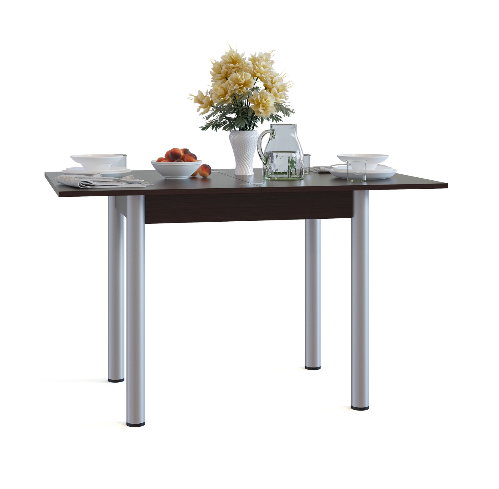 Раскладной обеденный стол с компактными размерами идеально пойдет для маленькой кухни. В сложенном виде размеры столешницы составляют всего 800х600 мм. Лаконичный стиль исполнения делает модель универсальной для любого интерьера.
