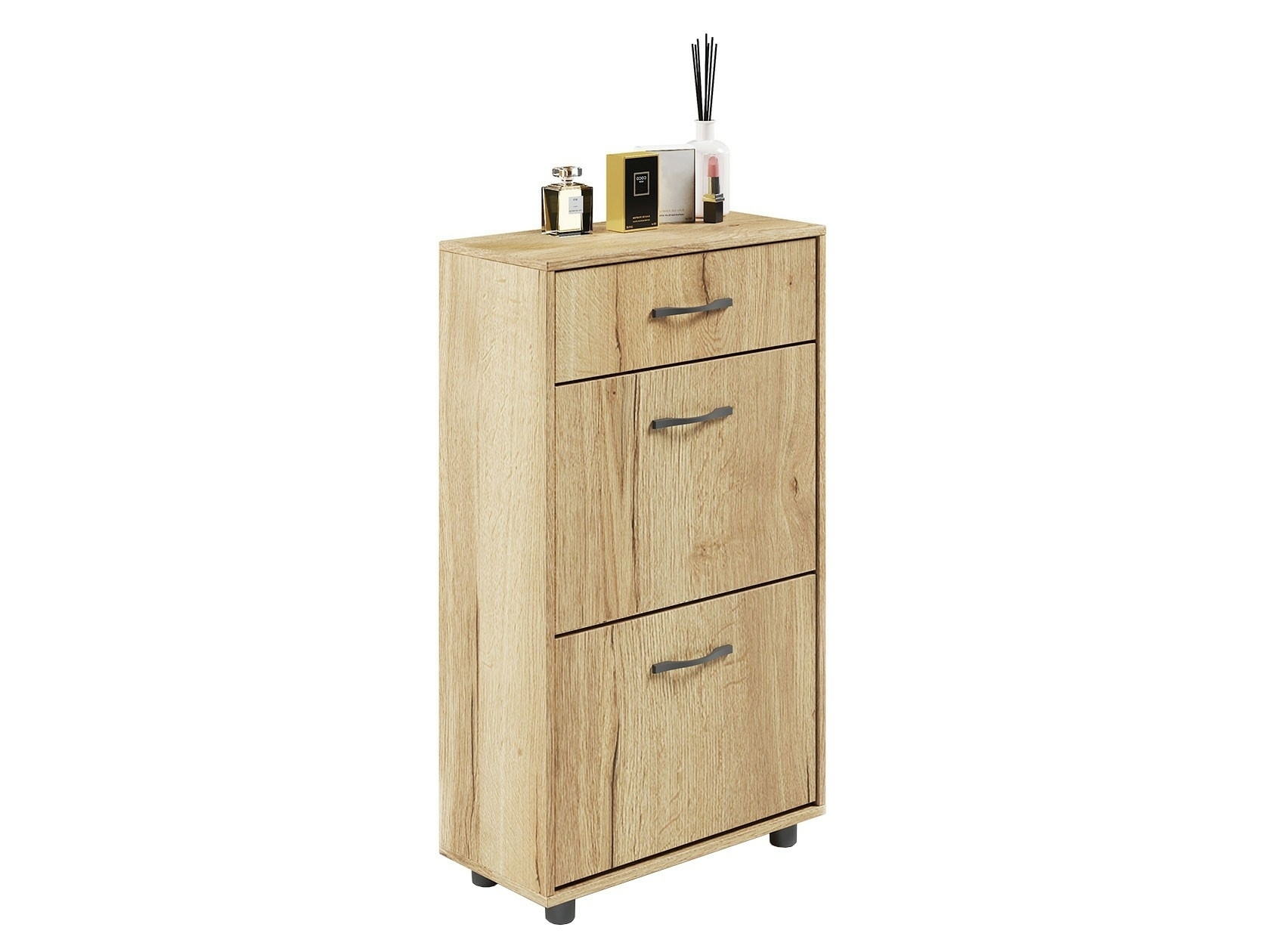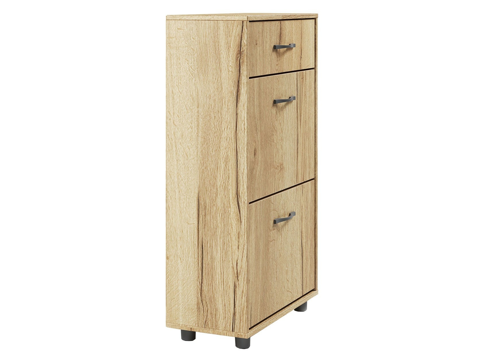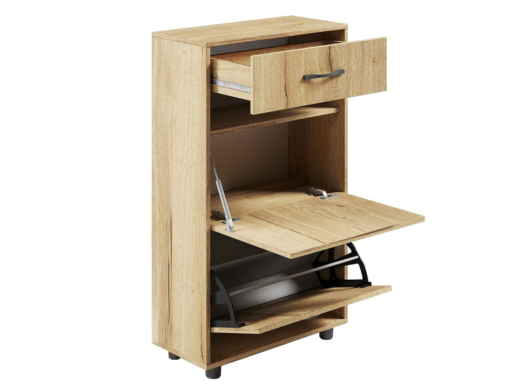 Вместительная тумба для обуви, шириной 600 мм. Верхний выдвижной ящик вместит все, что нужно взять с собой, выходя из дома. Средняя дверь оснащена откидывающимся механизмом со специальными полками для размещения обуви, который обеспечивает удобство хранения и легкий доступ к необходимой паре кроссовок или туфель. За нижней дверью также располагается отсек для хранения обуви.