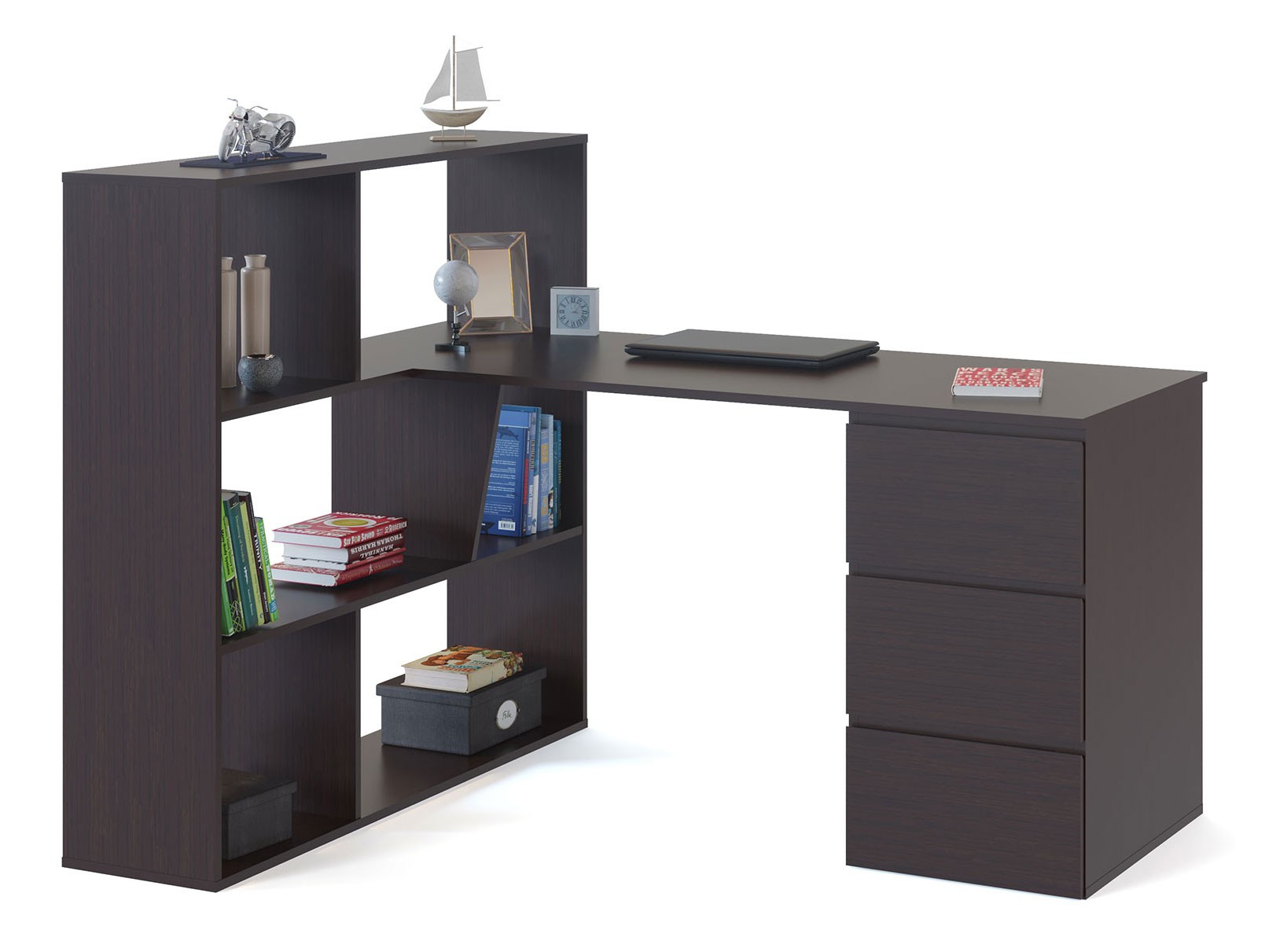 вместительность — модель оснащена стеллажом и тумбой с ящиками для удобного хранения всех необходимых для работы или учебы предметов;