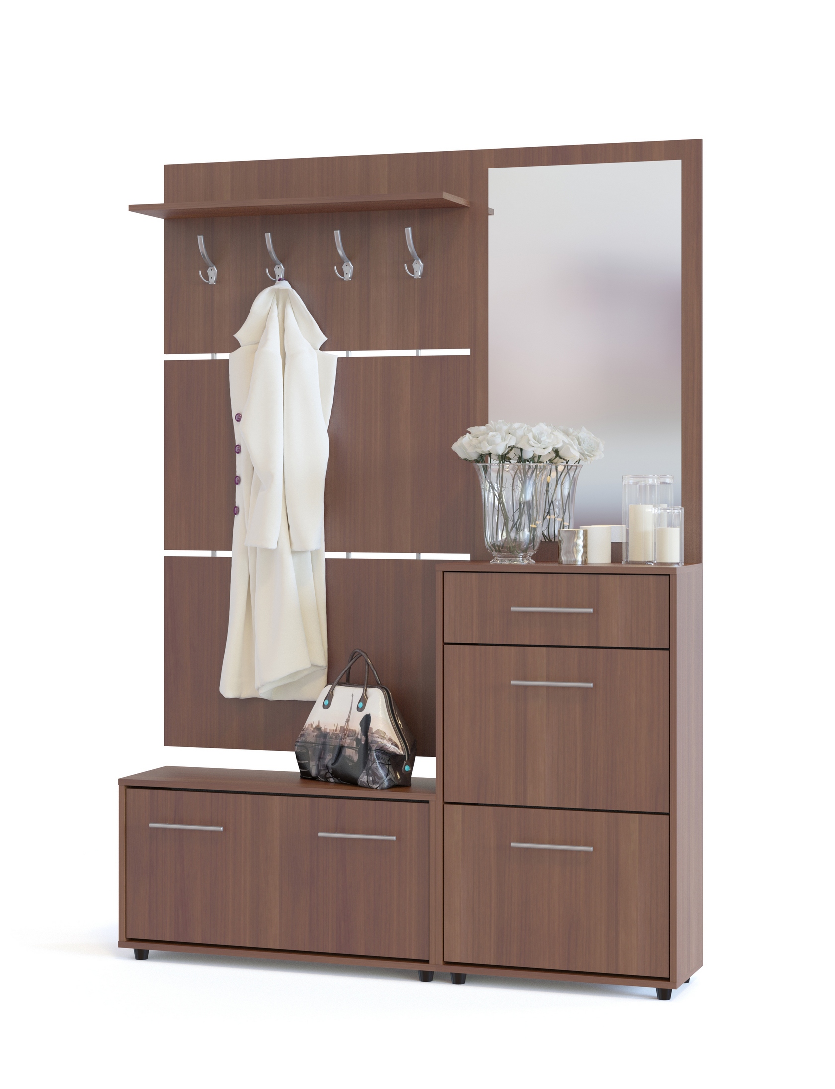 Широкая прихожая, состоящая из двух тумб для обуви, вешалки и зеркальной панели. Двери тумбы оснащены откидывающимся механизмом со специальными полками для размещения обуви, который обеспечивает удобство хранения и легкий доступ к необходимой паре обуви. Вешалка имеет полку для головных уборов.