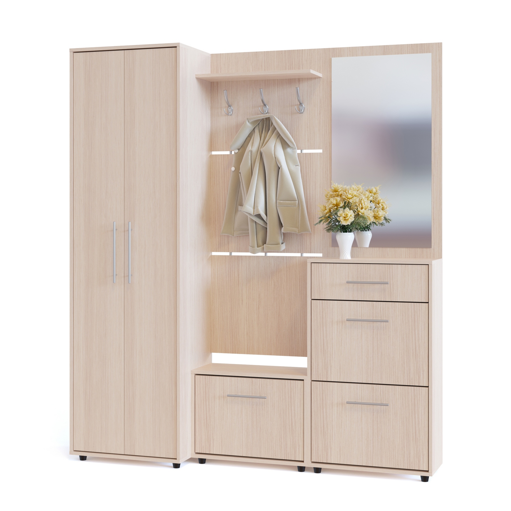 Вместительная модульная прихожая, состоящая из двух тумб для обуви, вешалки, зеркальной панели и двустворчатого шкафа. Двери тумбы оснащены откидывающимся механизмом со специальными полками для размещения обуви, который обеспечивает удобство хранения и легкий доступ к необходимой паре кроссовок или туфель.