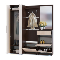 Вместительная модульная прихожая, состоящая из двух тумб для обуви, вешалки, зеркальной панели и двустворчатого шкафа. Двери тумбы оснащены откидывающимся механизмом со специальными полками для размещения обуви, который обеспечивает удобство хранения и легкий доступ к необходимой паре кроссовок или туфель.