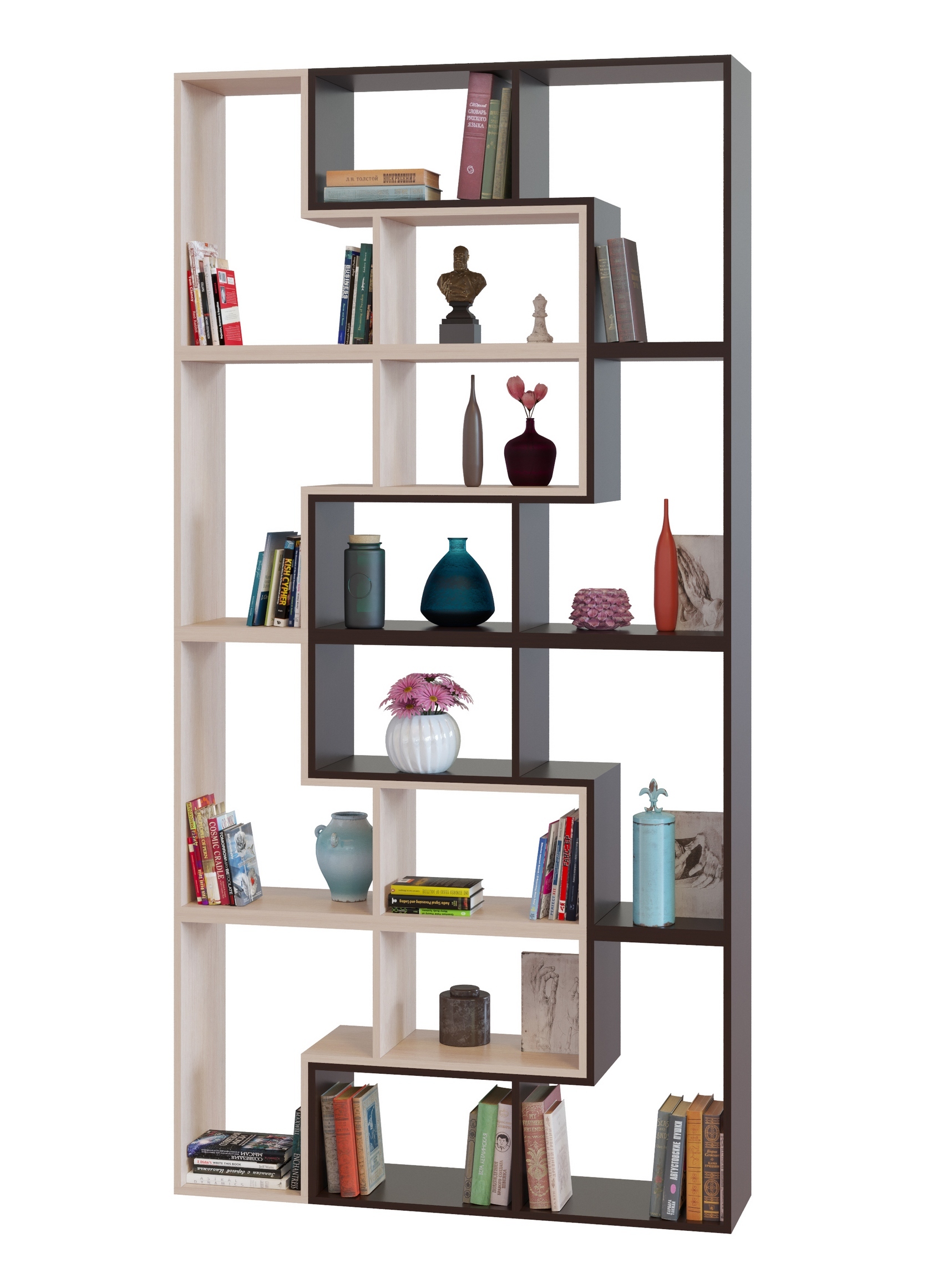 Высокий открытый стеллаж идеален для создания библиотеки в гостиной, в молодежной комнате или в домашнем кабинете. Большое количество полок разных размеров позволяют расставить разнокалиберные книги с удобным к ним доступом. Все корешки будут видны и вы сразу сможете найти нужное издание.