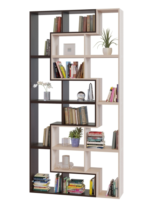 Собрать представленный стеллаж можно из модульных элементов четырех цветов: Венге, Беленый дуб, Белый и Дуб сонома: в однотонном варианте или комбинируя цвета. При заказе требуется указать сколько элементов какого цвета понадобится для создания уникального стеллажа.