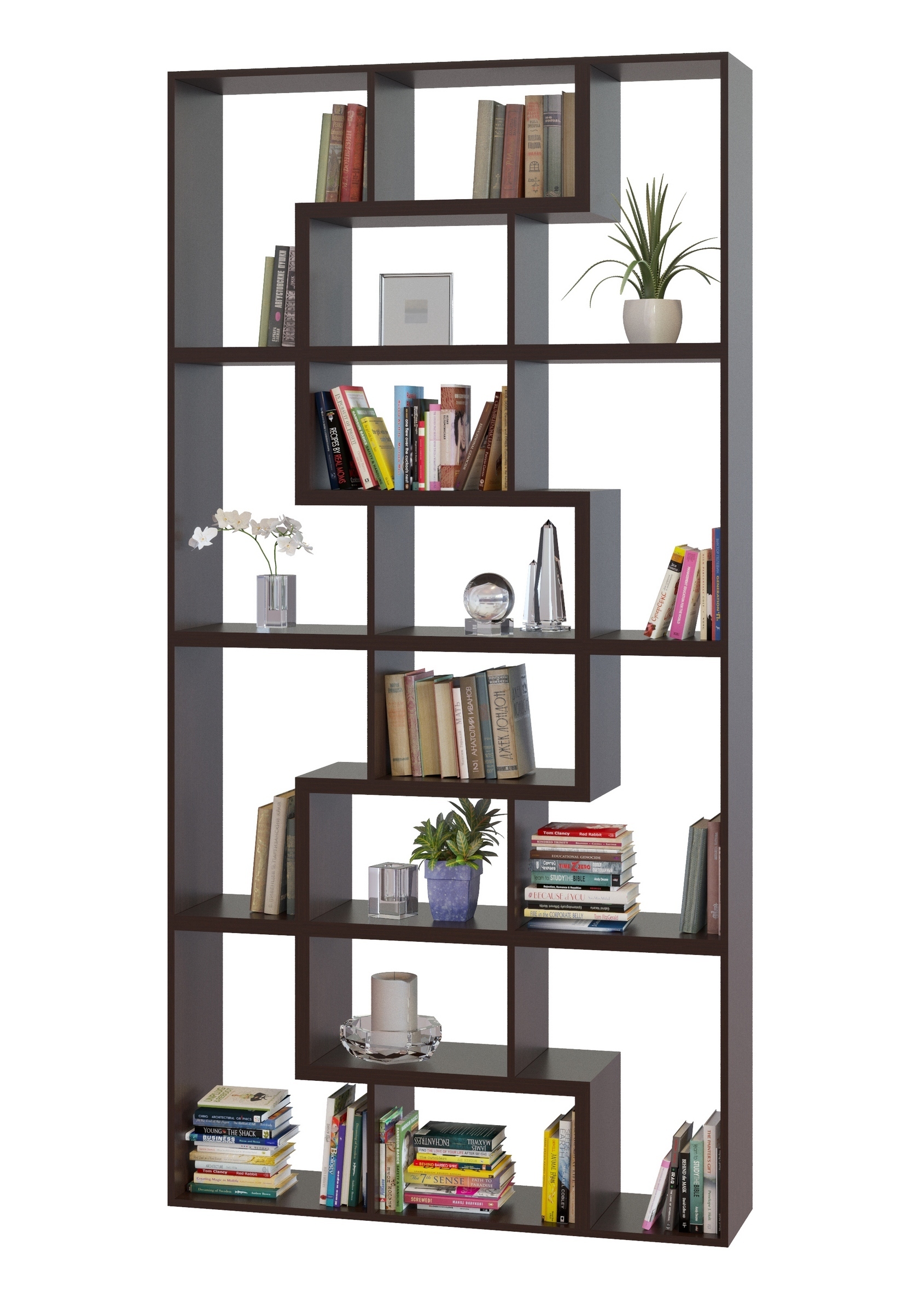 Собрать представленный стеллаж можно из модульных элементов четырех цветов: Венге, Беленый дуб, Белый и Дуб сонома: в однотонном варианте или комбинируя цвета. При заказе требуется указать сколько элементов какого цвета понадобится для создания уникального стеллажа.