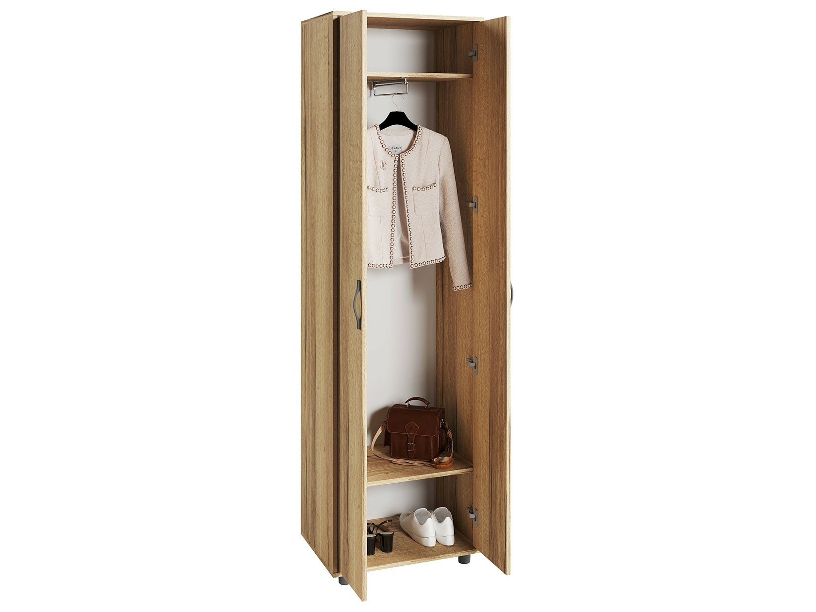 Шкаф для одежды, шириной 600 мм. Шкаф оборудован двустворчатыми дверями. Внутри шкафа расположены две полки и выдвижная вешалка.