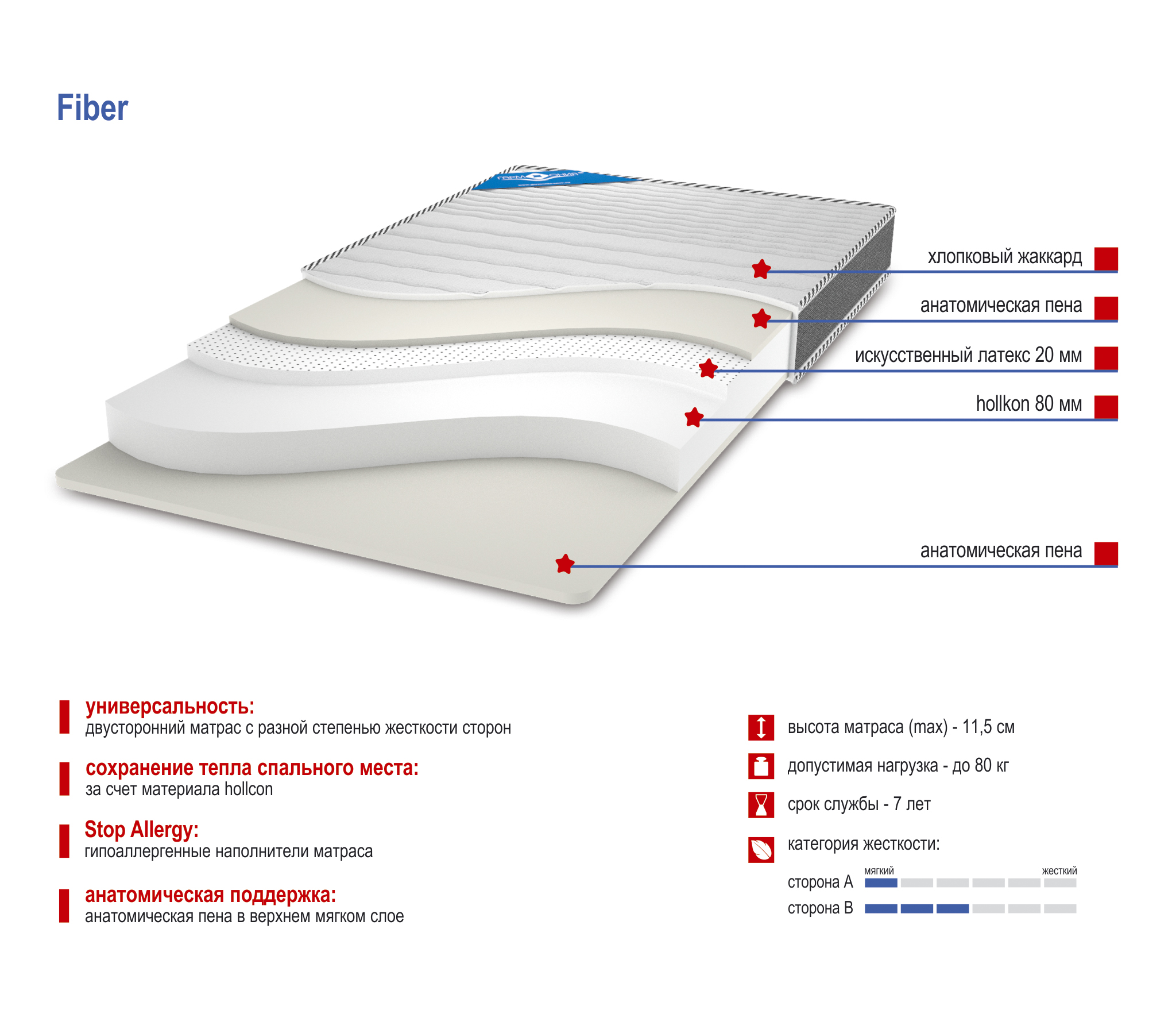 Матрас Fiber модель с разной жесткостью сторон. И если hollcon это «золотая середина» по жесткости, то латекс мягкий анатомический, но в то же время очень упругий наполнитель для максимального комфорта.