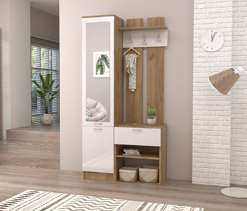 Прихожая Иннэс-3 — имеет простой дизайн и прямые формы, включает пенал с зеркалом с тремя просторными полками и вешалку с тремя трёхрожковыми крючками для одежды, антресольной полкой для головных уборов, выдвижным ящиком и открытой нишей.