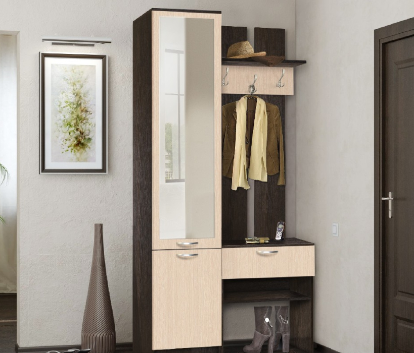 Прихожая Иннэс-3 — имеет простой дизайн и прямые формы, включает пенал с зеркалом с тремя просторными полками и вешалку с тремя трёхрожковыми крючками для одежды, антресольной полкой для головных уборов, выдвижным ящиком и открытой нишей.