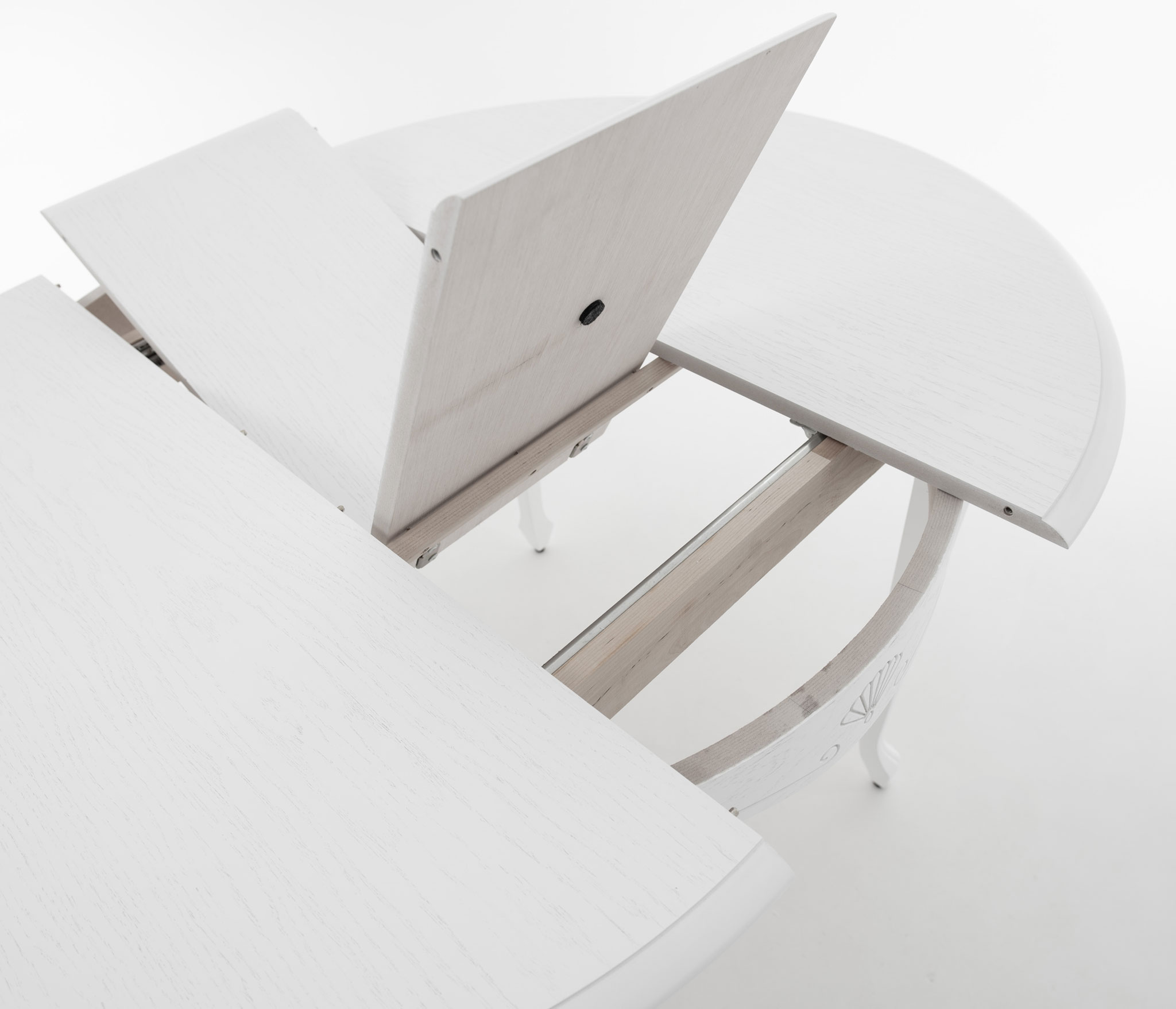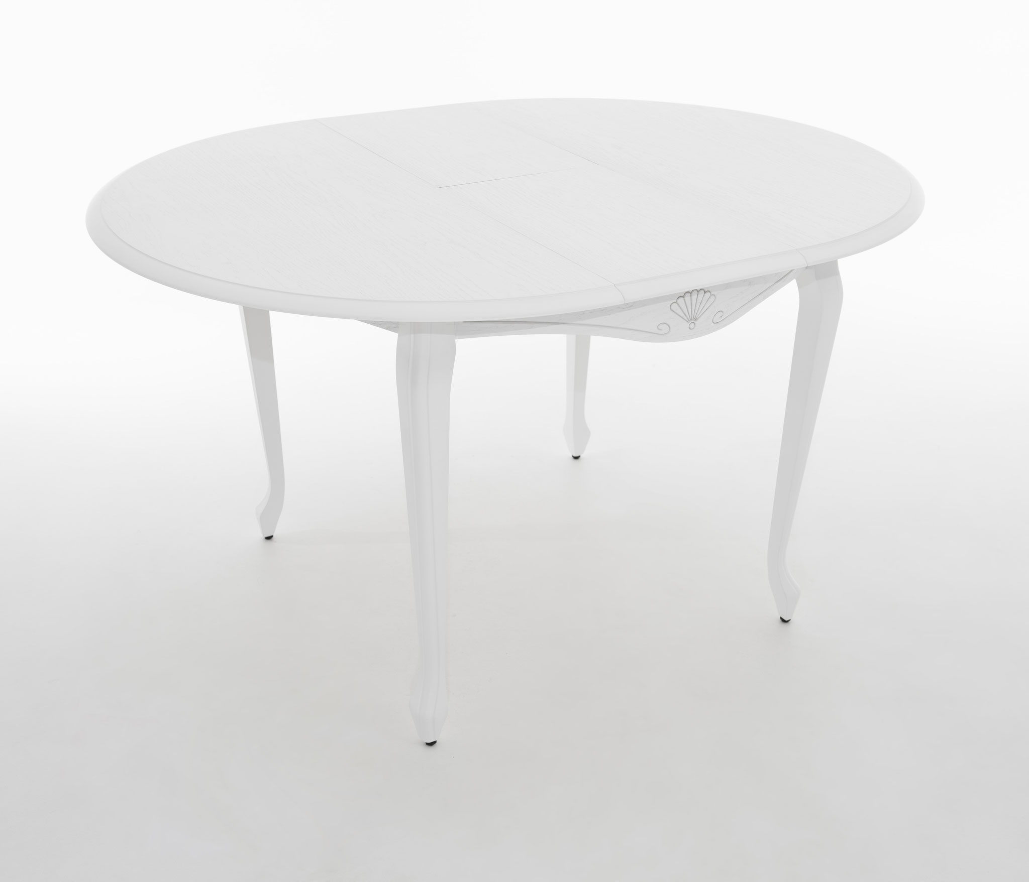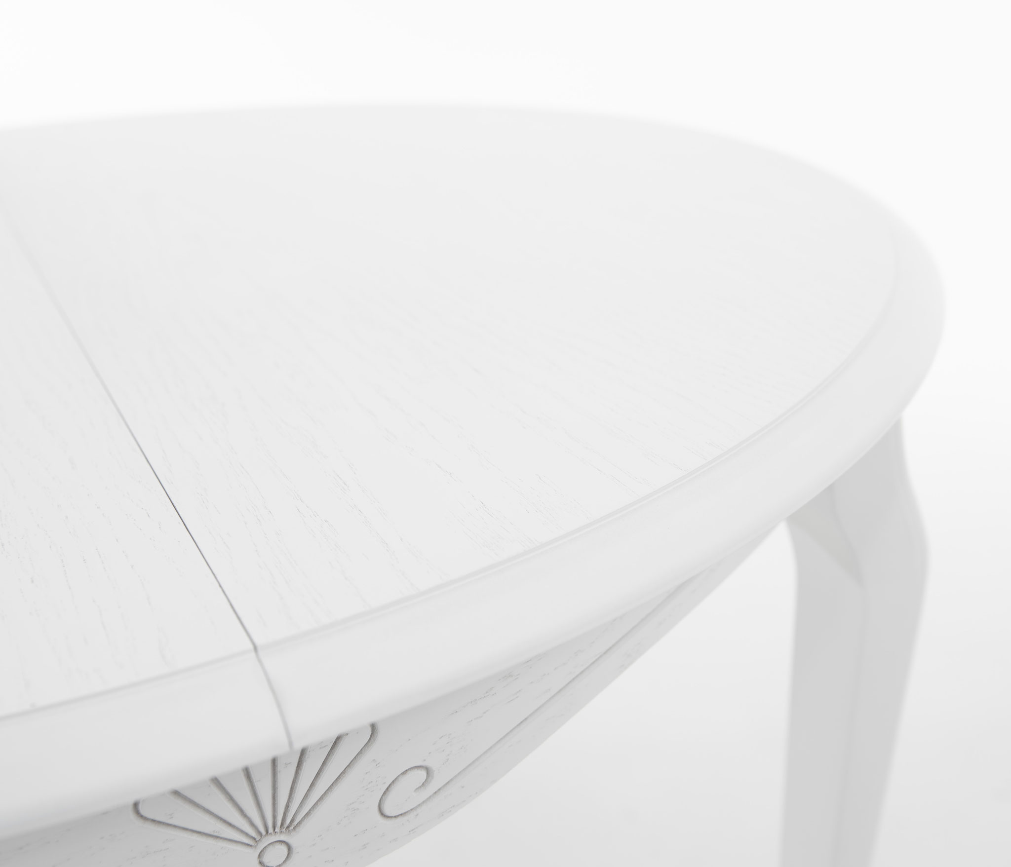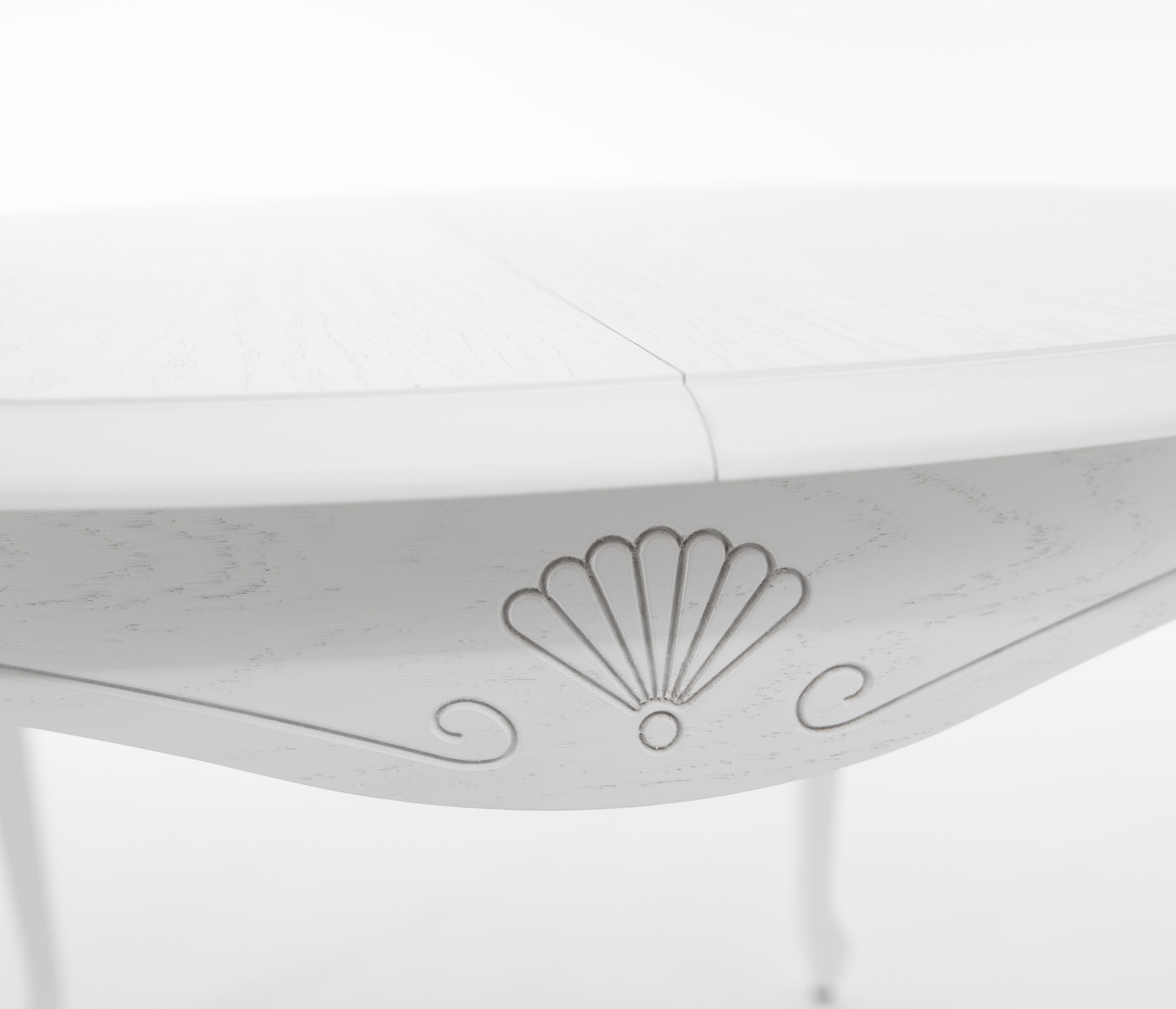 Обеденный раздвижной стол из массива березы со шпонированной поверхность столешницы. Синхронный механизм трансформации. Изящная форма ножек и фигурный царговый пояс. Патина подчеркивает изящность ног и оригинальный торец столешницы.