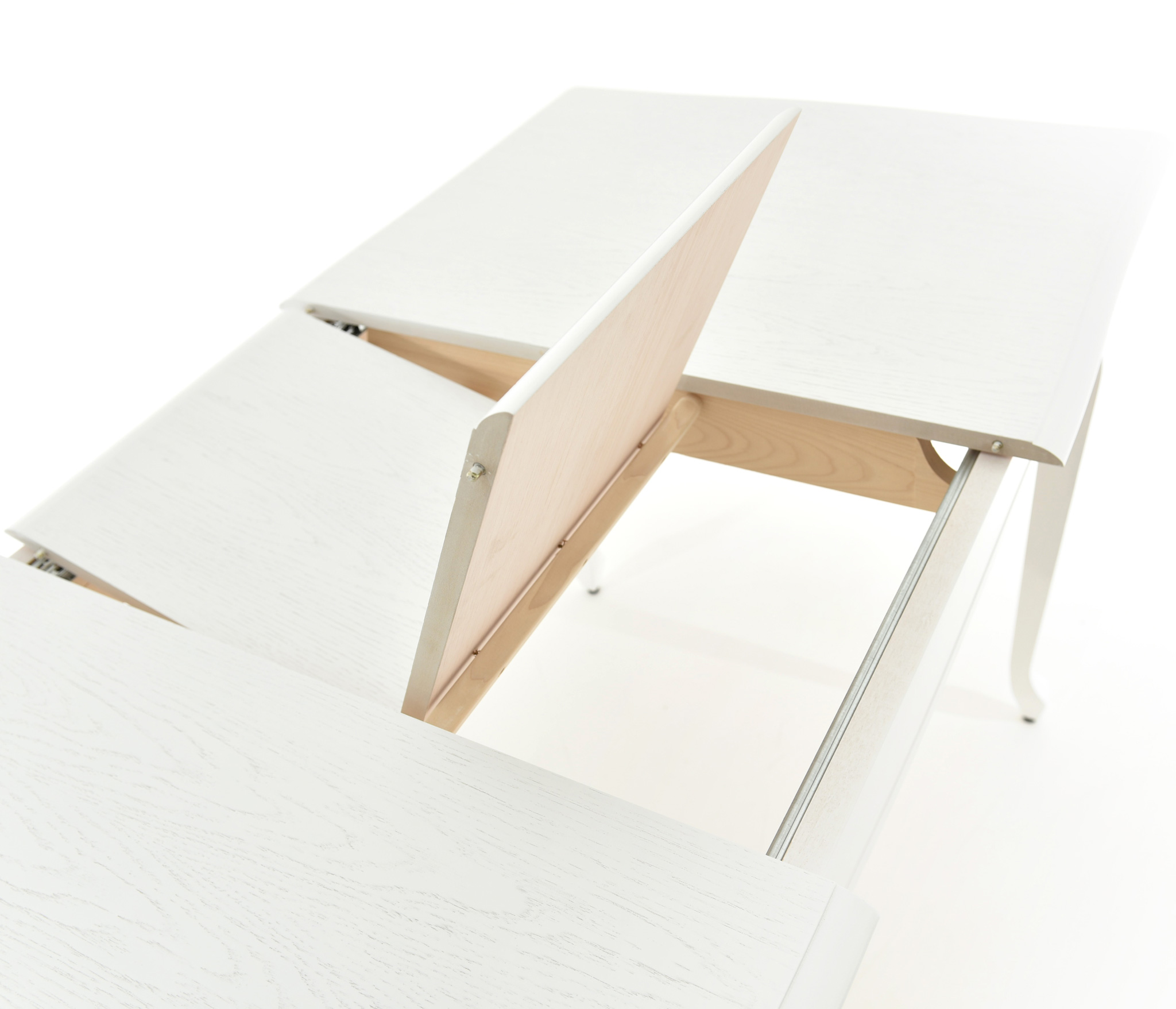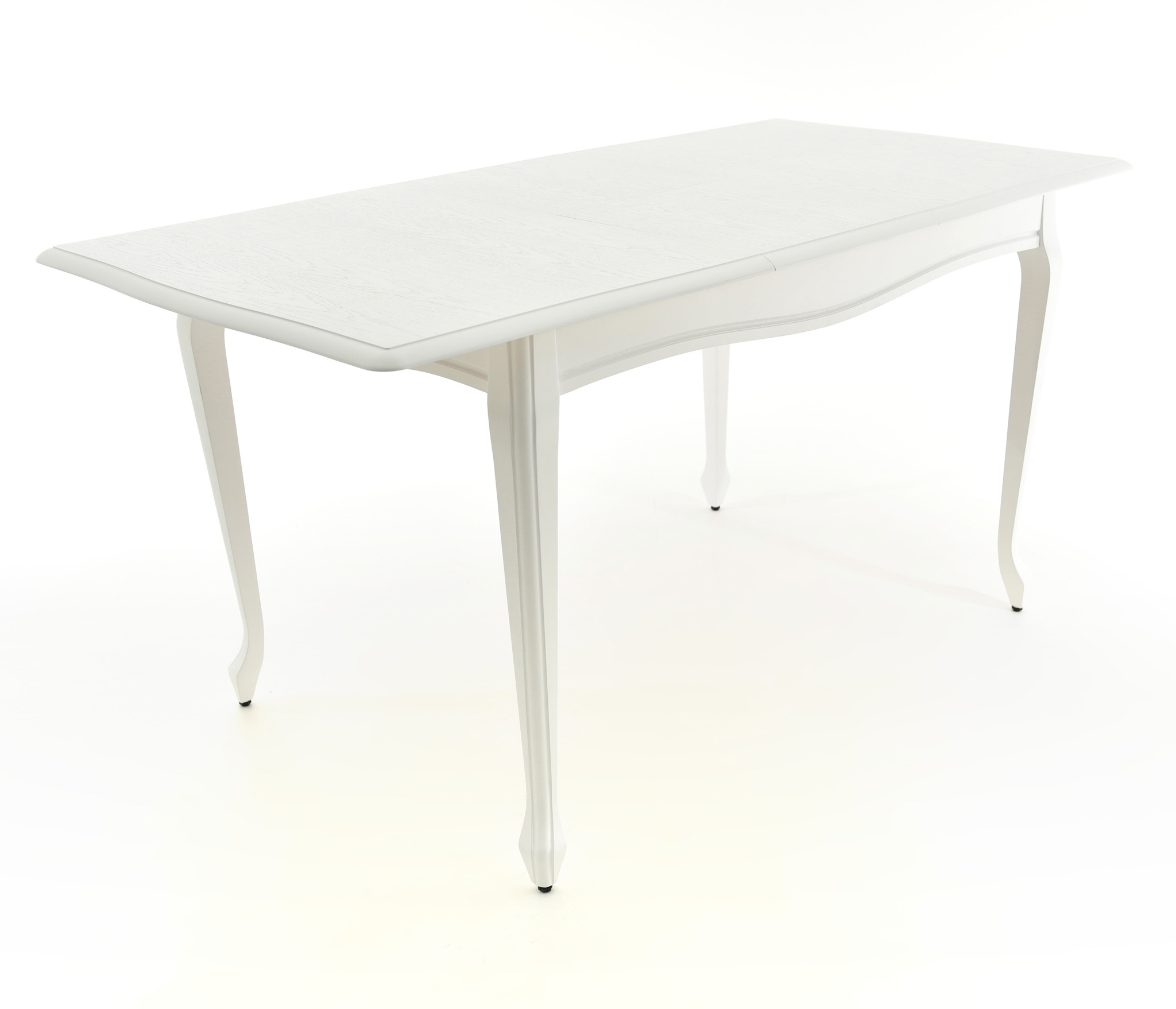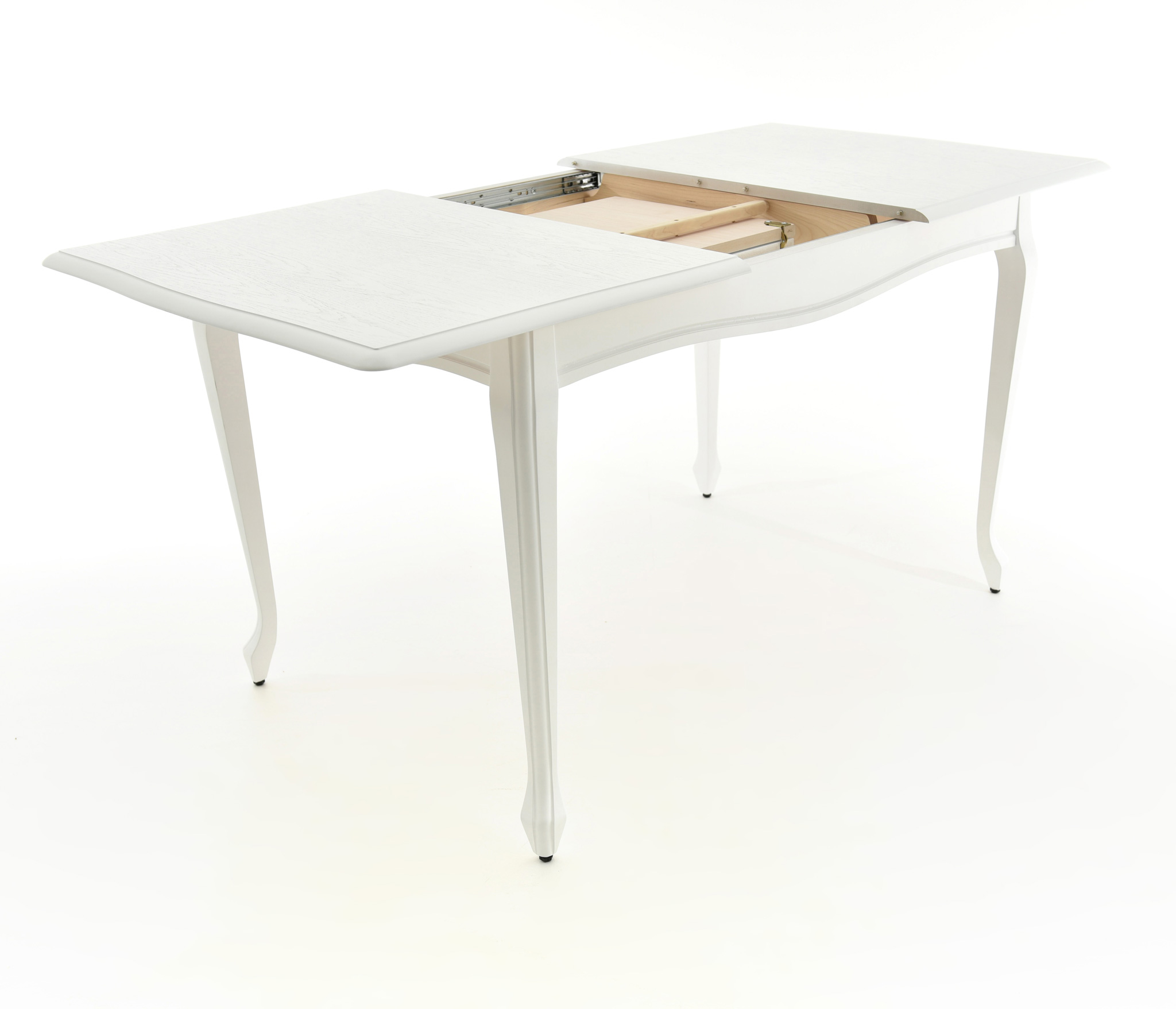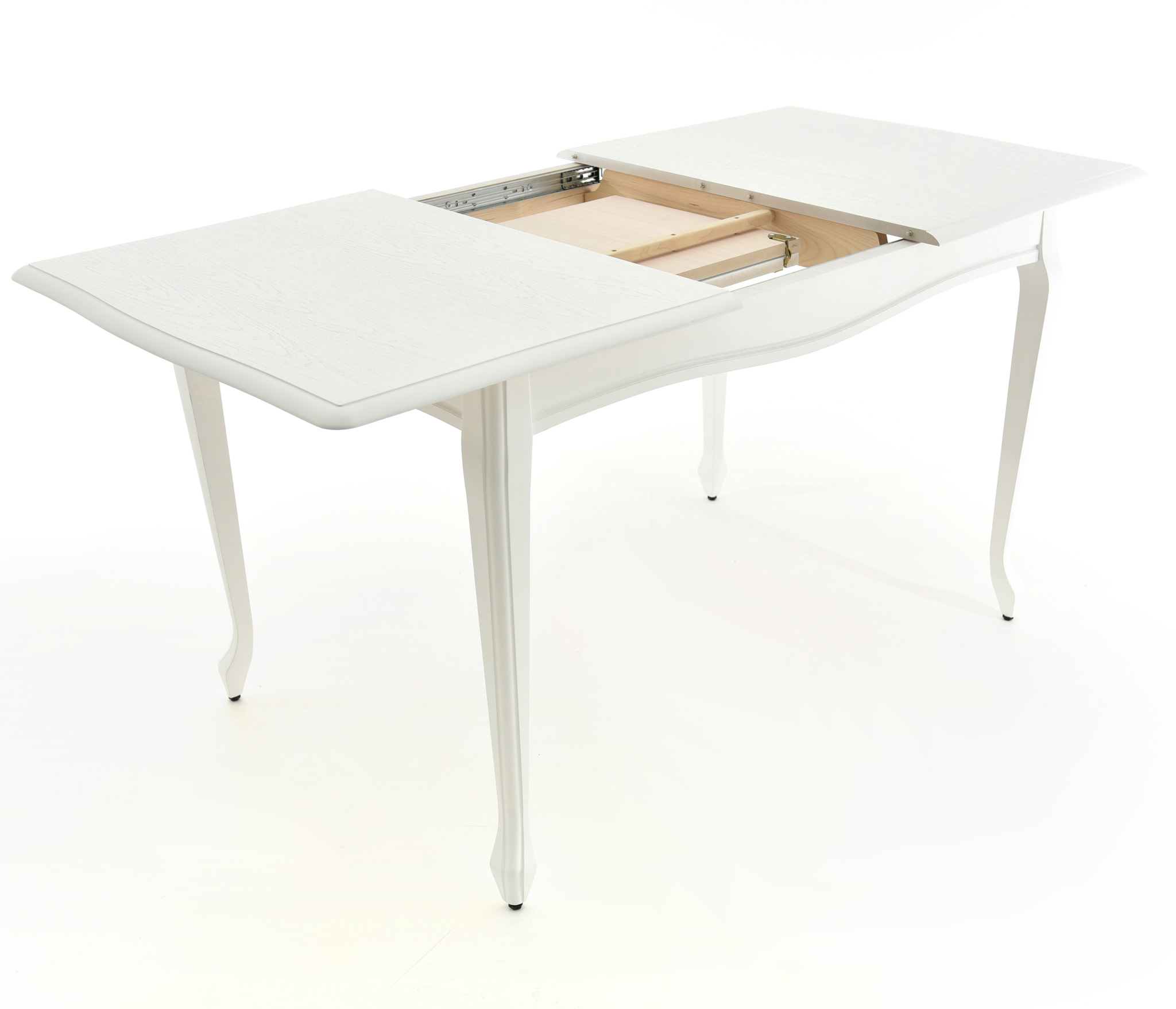 Обеденный раздвижной стол из массива березы со шпонированной поверхность столешницы. Синхронный механизм трансформации. Изящная форма ножек и фигурный царговый пояс.