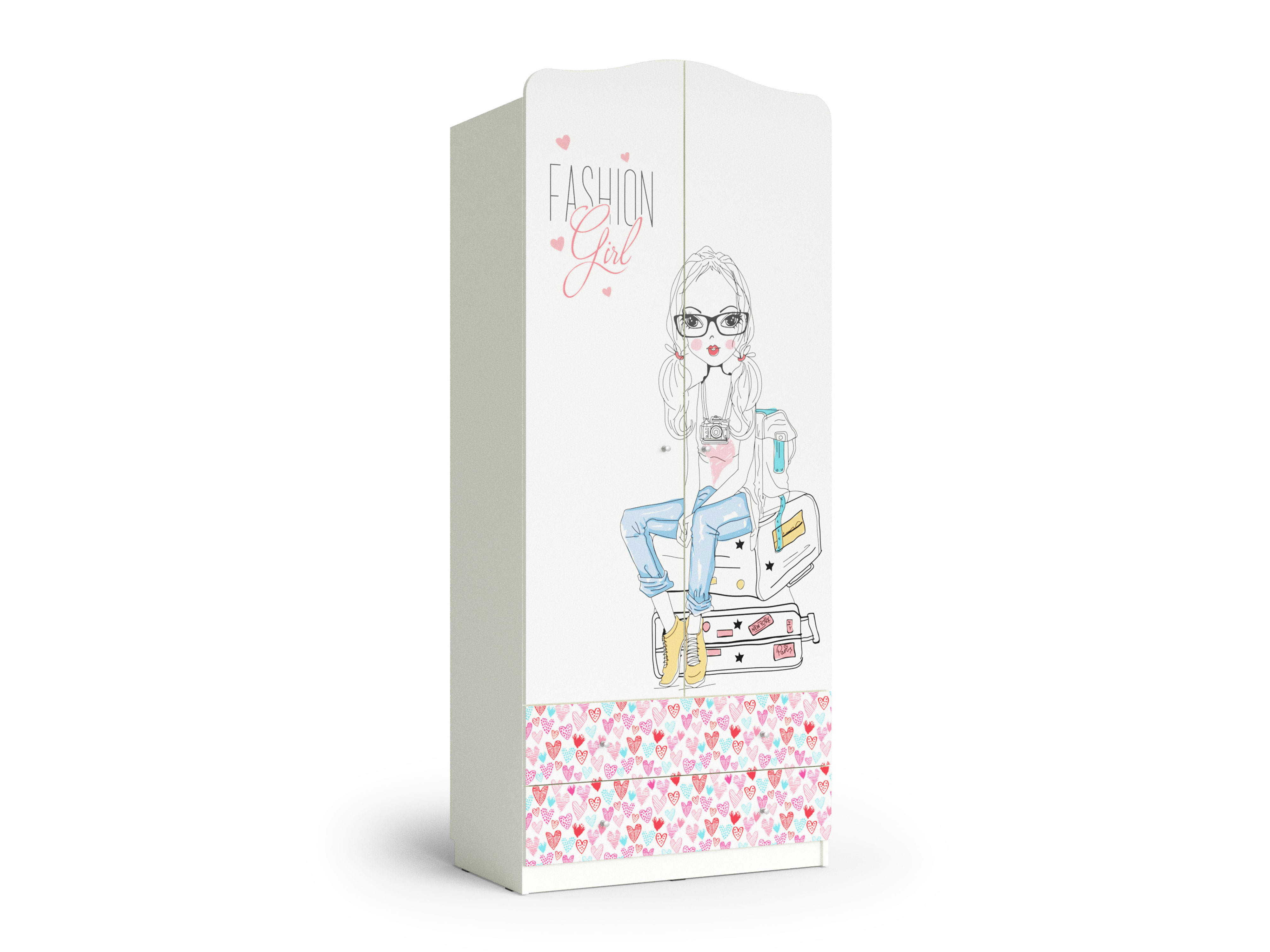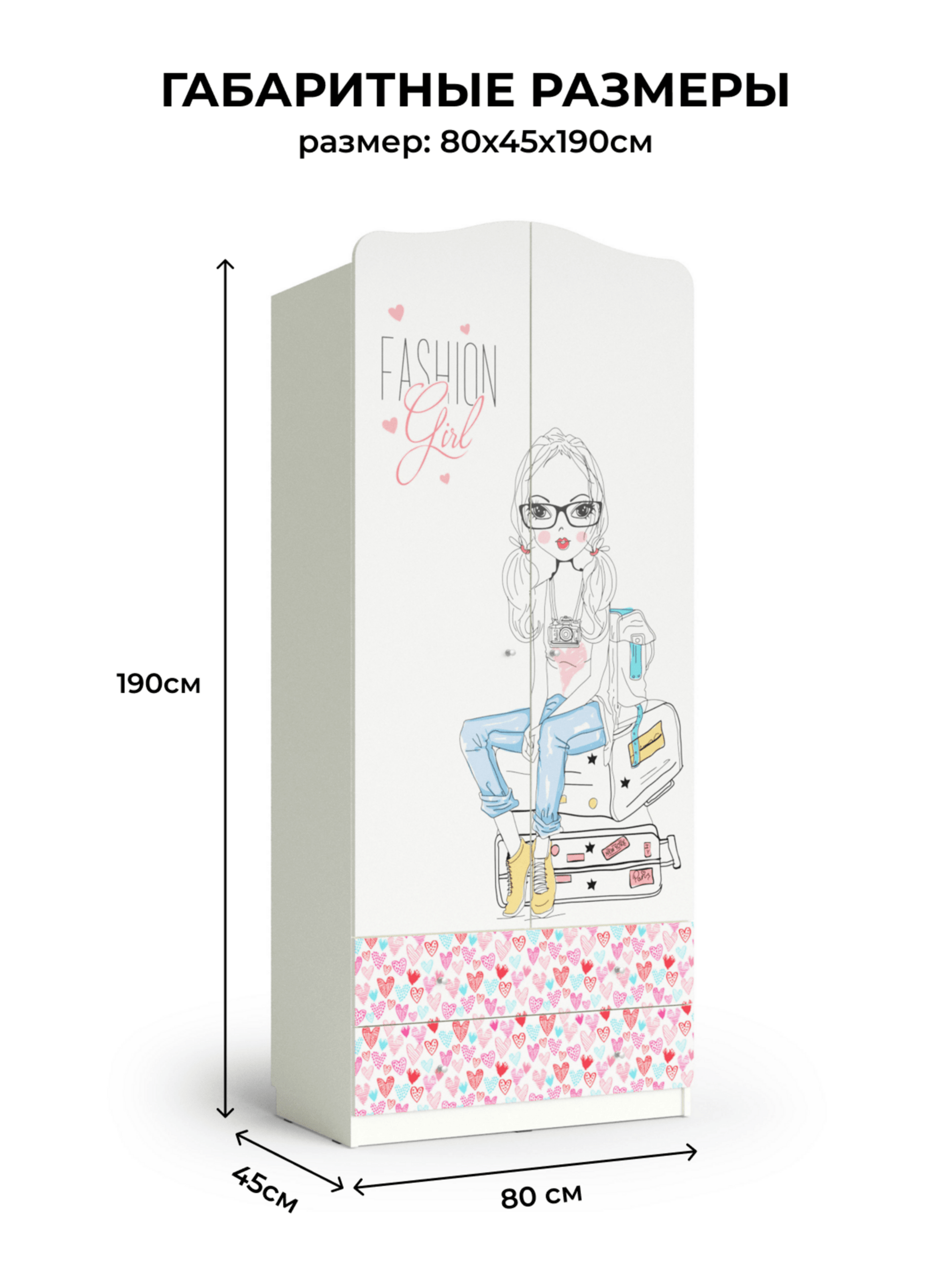 Шкаф из коллекции мебели для детской комнаты. Производство Россия. Изготовлен из ЛДСП с УФ печатью. Шкаф с двумя дверцами и двумя выдвижными ящиками. Внутри имеется штанга и верхняя полка