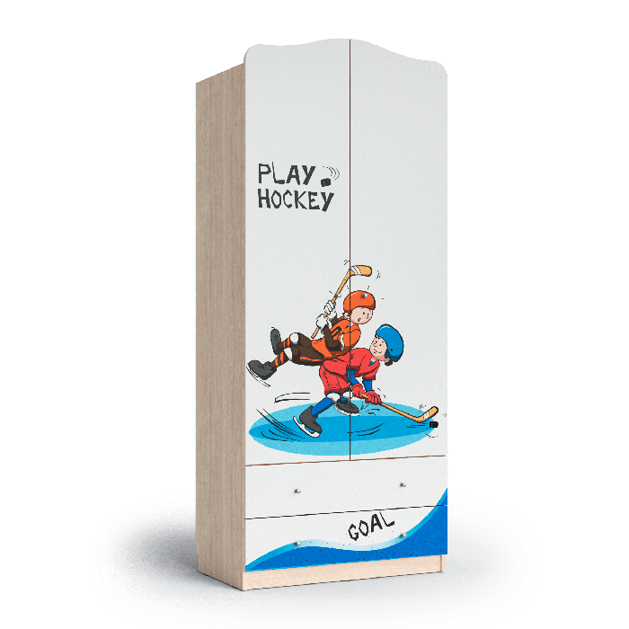 Шкаф из коллекции мебели для детской комнаты. Производство Россия. Изготовлен из ЛДСП с УФ печатью. Шкаф с двумя дверцами и двумя выдвижными ящиками. Внутри имеется штанга и верхняя полка