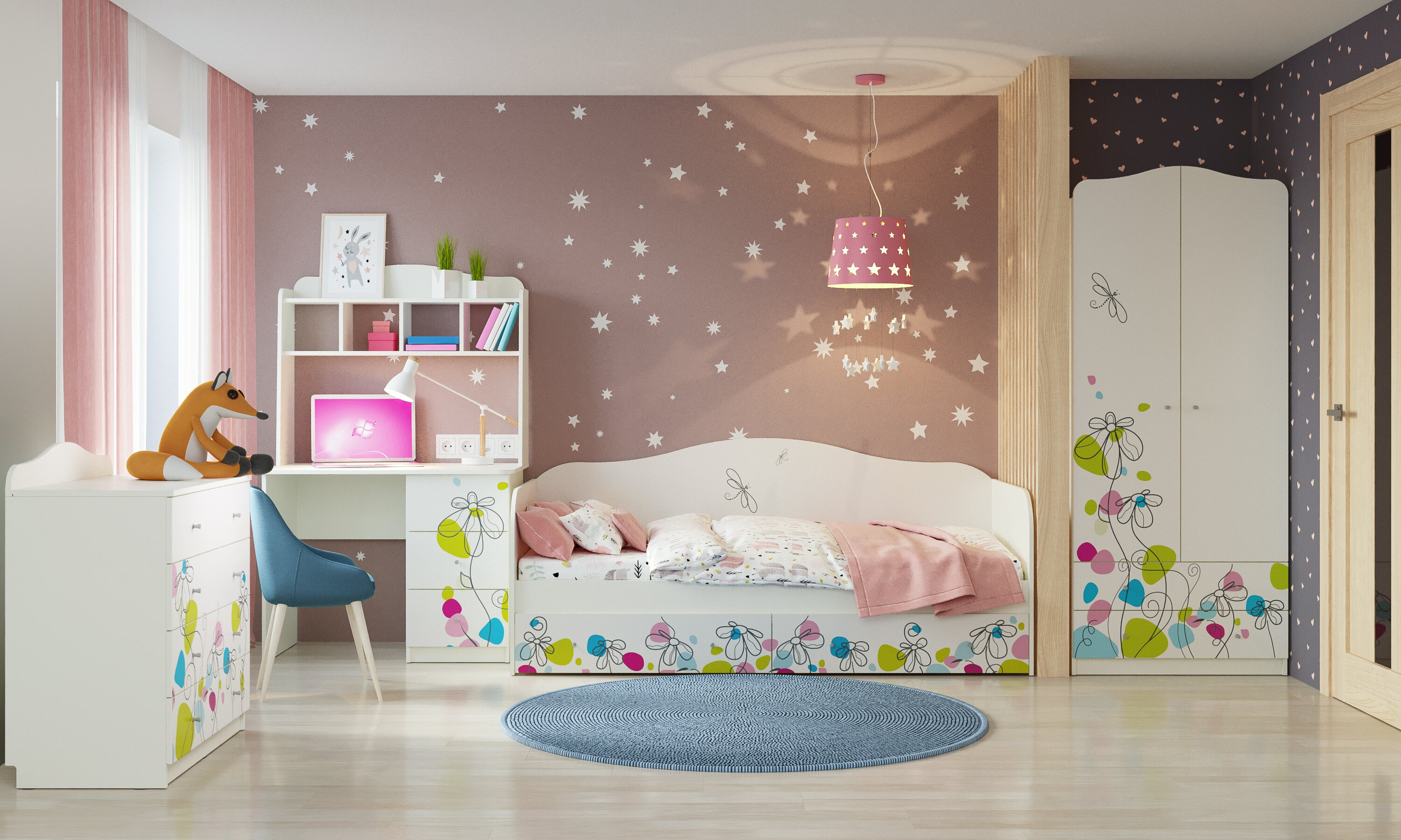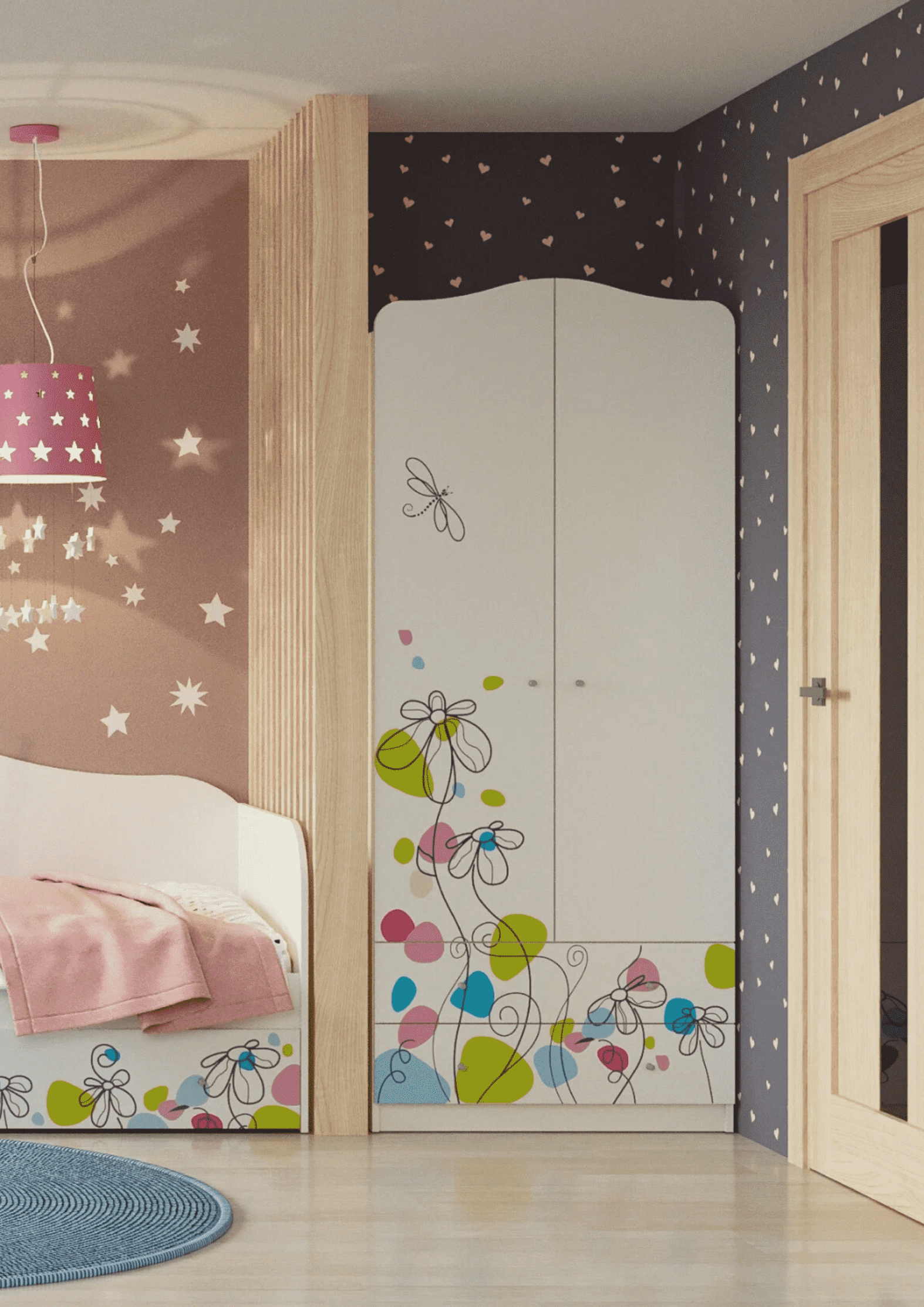Шкаф из коллекции мебели для детской комнаты. Производство Россия. Изготовлен из ЛДСП с УФ печатью. Шкаф с двумя дверцами и двумя выдвижными ящиками. Внутри имеется штанга и верхняя полка