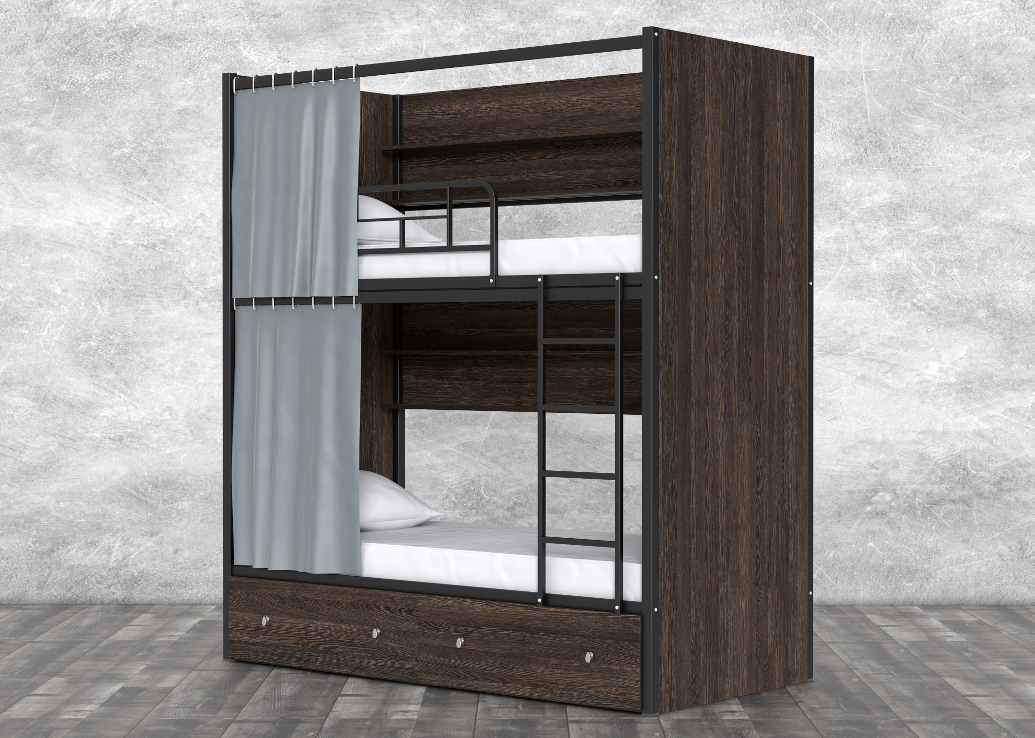 Двухъярусная металлическая кровать СамСон, отлично подойдет как взрослым так и детям. Каркас выполнен из стального профиля и покрыт порошковой краской. В комплект входят боковые панели, выкатные ящики для белья (на пластиковых колесиках) и 2 полки над каждым из ярусов, выполнены из ЛДСП класса Е1. Данная модель нашла широкое применение в хостелах и небольших гостиницах. Шторки не входят в комплект и приобретаются дополнительно.