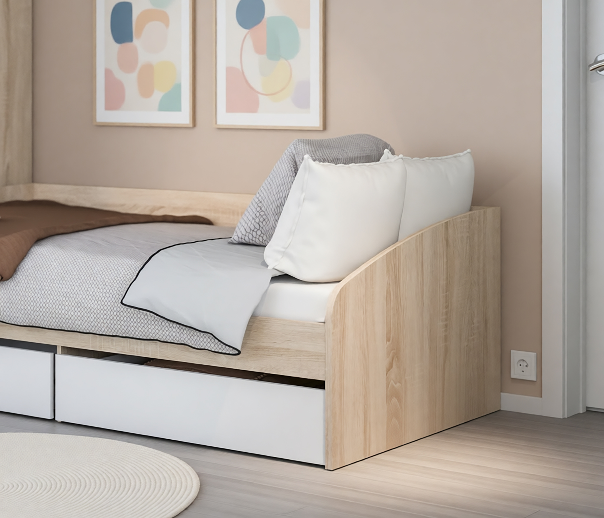 Кровать из детского гарнитура «Мамбо» – симпатичная и комфортабельная модель, воспользоваться которой могут даже взрослые члены семьи. Занимая не так уж и много места, она выделяется своей функциональной значимостью. Три в одном. Днем это вполне приличный диванчик, ночью полноценное спальное место шириной 95 см, к тому же, это и система хранения постельных принадлежностей, так как модель оборудована двумя объемными выдвигающимися ящиками. Кровать собрана из мебельных щитов повышенной прочности с износостойким поверхностным покрытием приятного пастельного оттенка «Дуб Сонома». Ящики и фасады к ним изготовлены из ДСП песочного цвета. Неброское сочетание цветов вносит в интерьер гармонию и умиротворение, что бывает нелишним, когда требуется успокоить разыгравшегося ребенка.