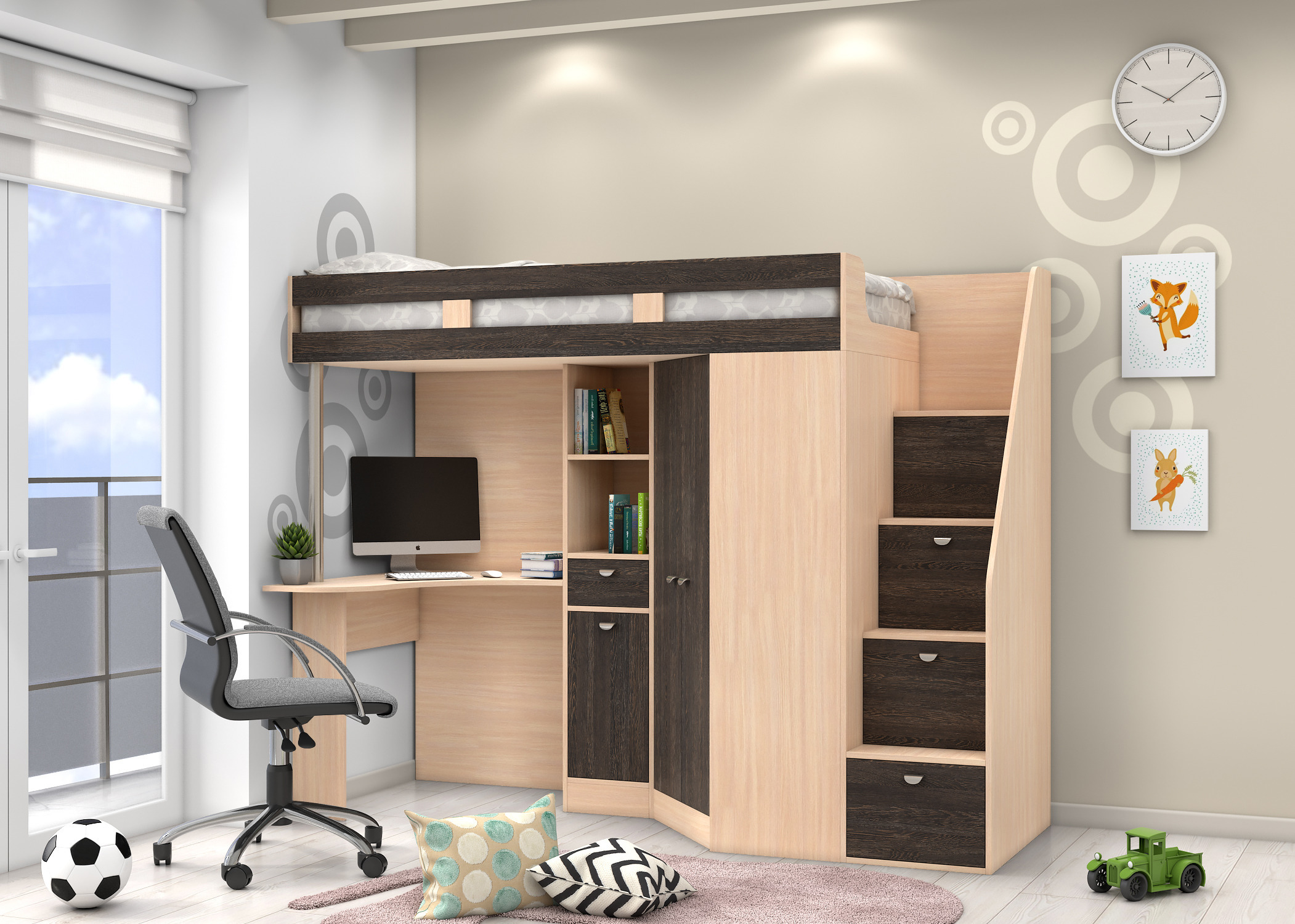Кровать-чердак 3 в одном!!! Шкаф, кровать и письменный стол. Мало занимает в комнате места! Дочка влюбилась в кровать. Собирал кровать муж! Все доступно написано, никаких сложностей не возникло)))