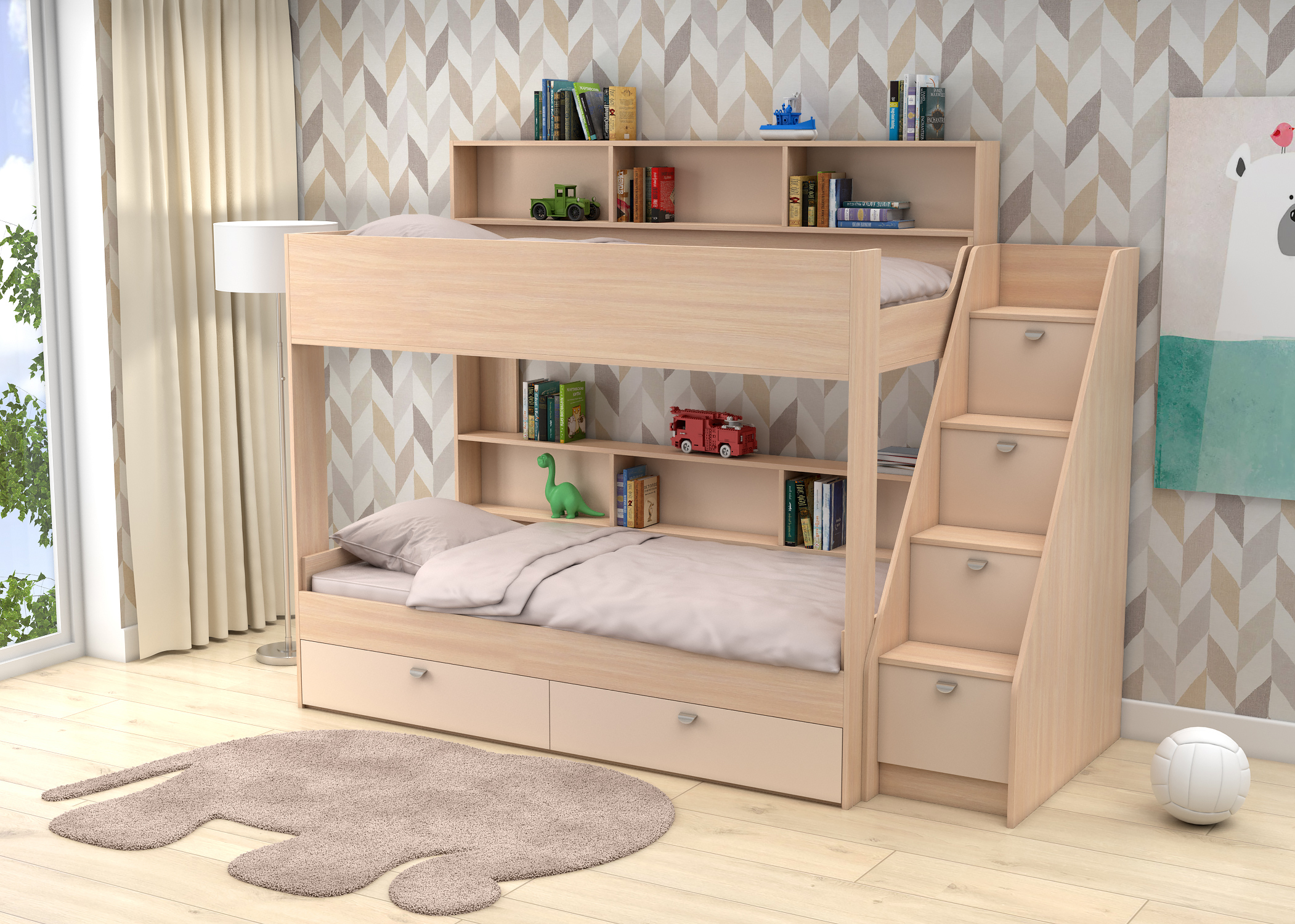Кровать очень хорошая, но очень большая. К детям в комнату поместилась прям в притык. Лестница удобная и ящики вместительные.