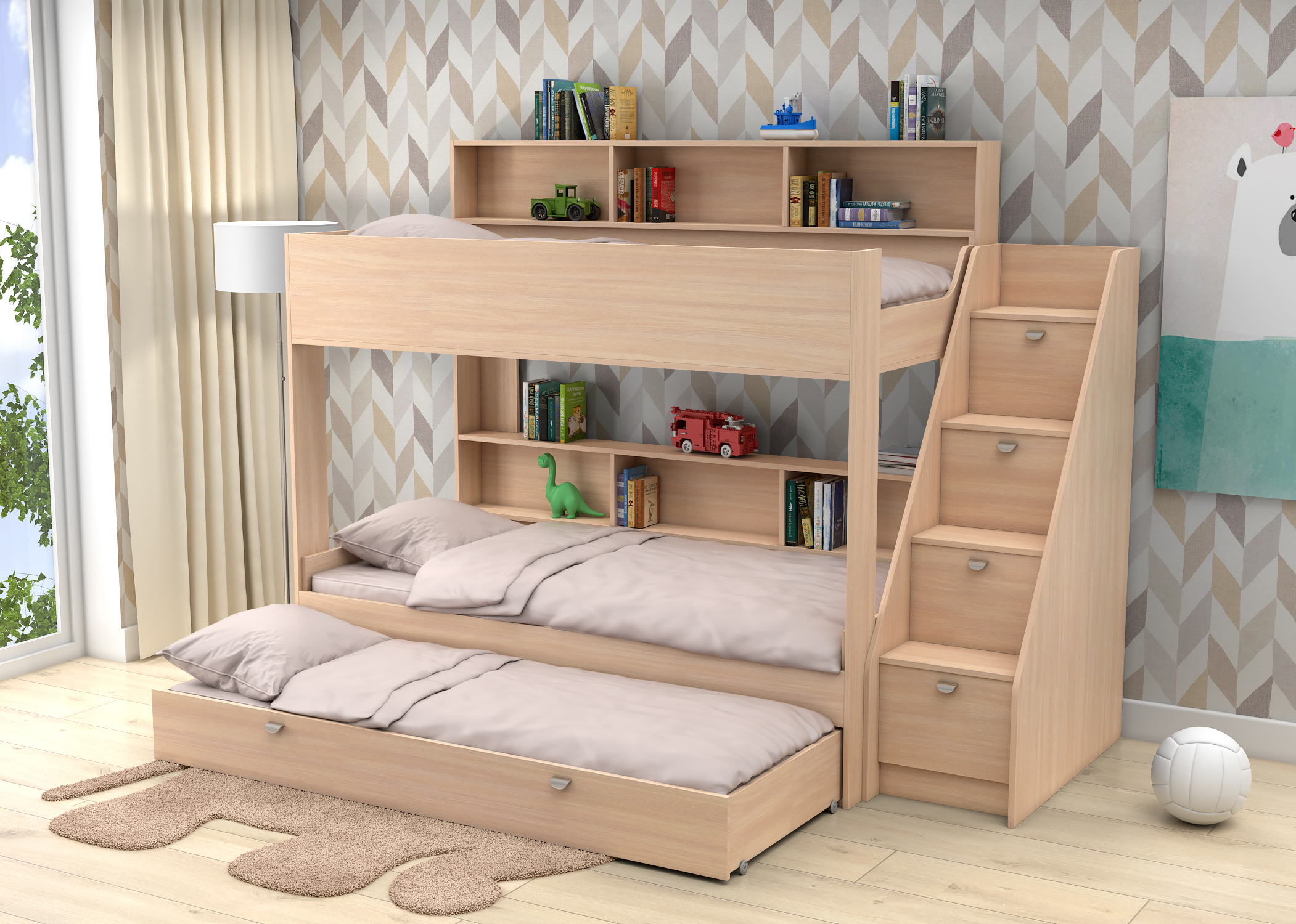 Кровать изготовлена из экологичной ламинированной древесно-стружечной плиты (ЛДСП), эта кровать надежная и эргономичная. Размер спального места 90х190, имеется дополнительная выдвижная кровать, спальным местом 85х185 см. Рекомендуемая высота матраса на два основных спальных места - от 10 до 19 см, на выкатное спальное место - не более 11 см. Матрасы в комплект кровати не входят. В комплектацию кровати входит удобная лестница-комод с 3 (тремя) выдвижными ящиками глубиной 30 см. Данная модель кровати универсальна при сборке - лестницу-комод можно устанавливать как с левой, так и с правой стороны.
