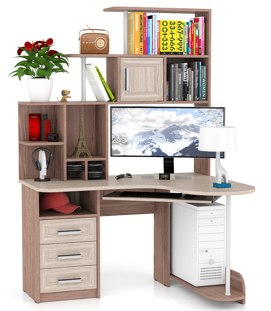 Угловой компьютерный стол Варяг-3 - полноценная домашняя рабочая станция. За счёт криволинейных частей стол красиво выглядит. А благодаря универсальной сборке, Вы сможете расположить стол в удобном для Вас ракурсе. Стол имеет большую угловую столешницу, выкатную панель для клавиатуры, тумбу, подставку под системный блок, и надстройку с множеством полочек, стойкой для дисков и закрытой нишей. Всё вместе составляет удобное рабочее место для Вас или Вашего ребёнка, для дома и офиса. Большая угловая столешница имеет эргономичную форму. Закруглённые края делают стол травмобезопасным. На столешнице достаточно место для рабочих и учебных принадлежностей, канцелярских товаров и монитора, а при желании и ноутбука. Под столешницей расположена выкатная панель для клавиатуры. Один край столешницы установлен на хромированную стойку, другой на тумбу с выдвижными ящичками. На столешнице размещена надстройка с полочками, закрытой нишей с распашной дверкой и стойкой для дисков. Надстройка имеет вместительную нишу, позволяющую разместить монитор любого размера. Надстройка делает рабочее место особенно удобным - всё нужное находится на расстоянии вытянутой руки, а важные вещи и документы можно хранить в закрытой нише. Закруглённые формы полочек и столешницы, хромированные детали, современная фурнитура делают дизайн стола привлекательным. Стол оборудован пластиковыми подпятниками, предохраняющими Ваше напольное покрытие от повреждения.