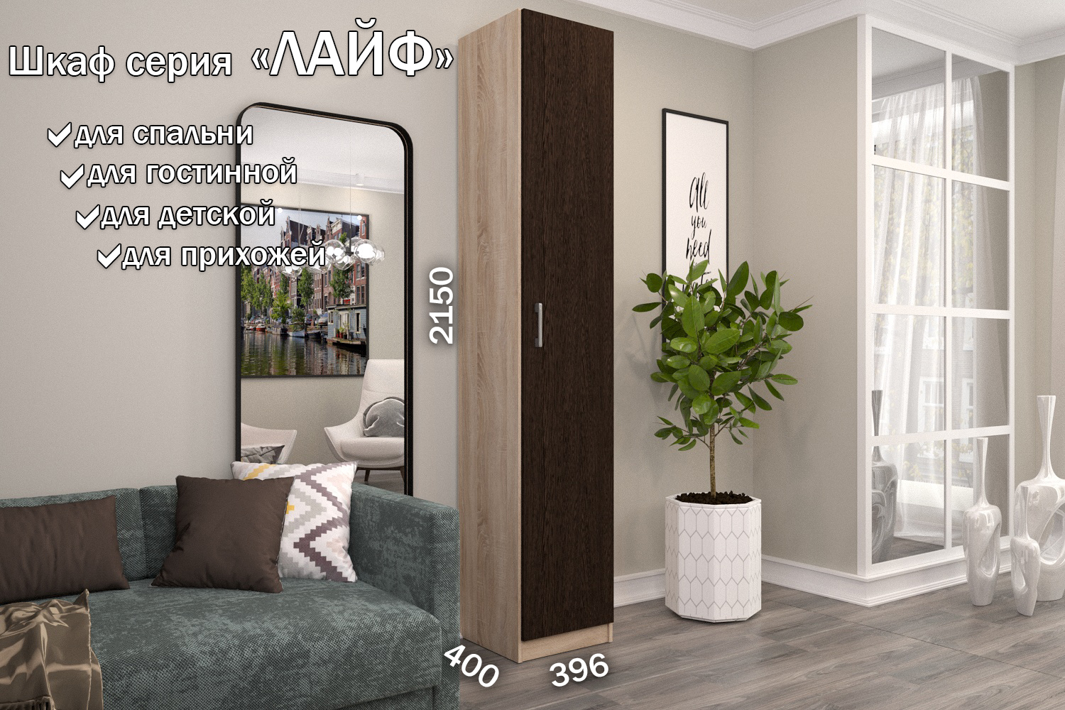 Отличительные особенности шкафов «Лайф» – качественные материалы, удобная комплектация внутреннего наполнения и отличная фурнитура, которая обеспечивает долговечность использования и дает простоту и надежность сборки. Данная серия может комбинироваться в любых четырех цветах на усмотрение и вкус покупателя, независимо от того - корпус это или фасад изделия. Используемые цвета: Венге, Дуб Сонома, Дуб Экспрессив бронзовый, Северное дерево.