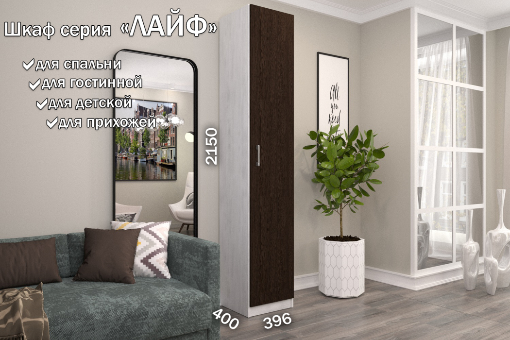 Отличительные особенности шкафов «Лайф» – качественные материалы, удобная комплектация внутреннего наполнения и отличная фурнитура, которая обеспечивает долговечность использования и дает простоту и надежность сборки. Данная серия может комбинироваться в любых четырех цветах на усмотрение и вкус покупателя, независимо от того - корпус это или фасад изделия. Используемые цвета: Венге, Дуб Сонома, Дуб Экспрессив бронзовый, Северное дерево.