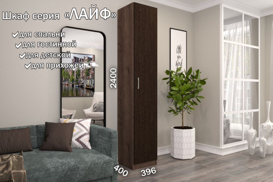 Стильные и удобные корпусные шкафы и наборные корпусные элементы «Лайф» – одно из самых выгодных предложений серийной мебели. Уникальностью данных шкафов, является возможность вносить изменения при сборке. Внутренние детали крепятся на эксцентриках, что позволяет в момент сборки изделия менять секций местами, это дает возможность выбрать максимально удобное расположение. Отличительные особенности шкафов «Лайф» – качественные материалы, удобная комплектация внутреннего наполнения и отличная фурнитура, которая обеспечивает долговечность использования и дает простоту и надежность сборки. Данная серия может комбинироваться в любых четырех цветах на усмотрение и вкус покупателя, независимо от того - корпус это или фасад изделия. Используемые цвета: Венге, Дуб Сонома, Дуб Экспрессив бронзовый, Северное дерево.