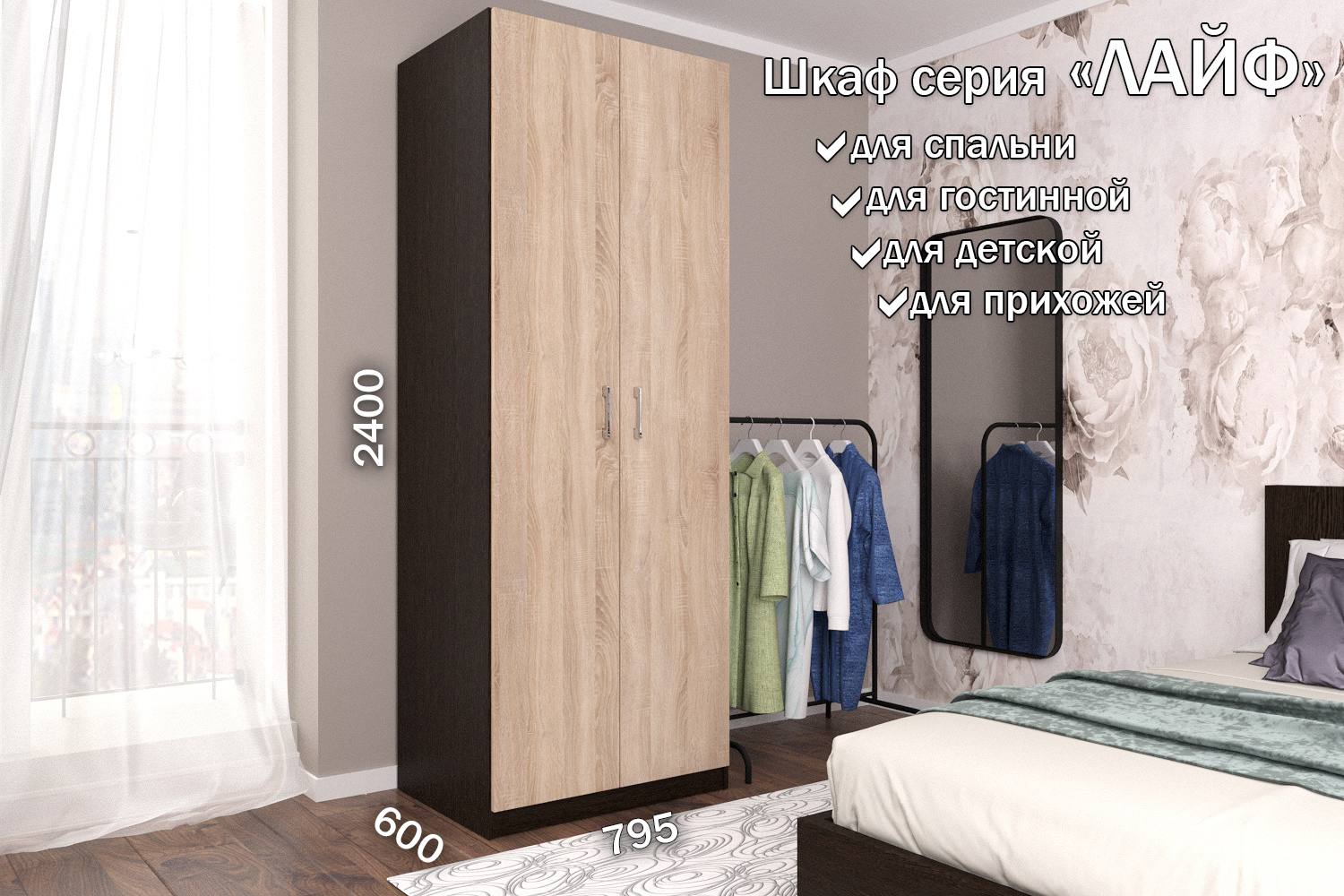 Распашной шкаф Лайф для одежды 80*60*240 Венге (Дуб Сонома)