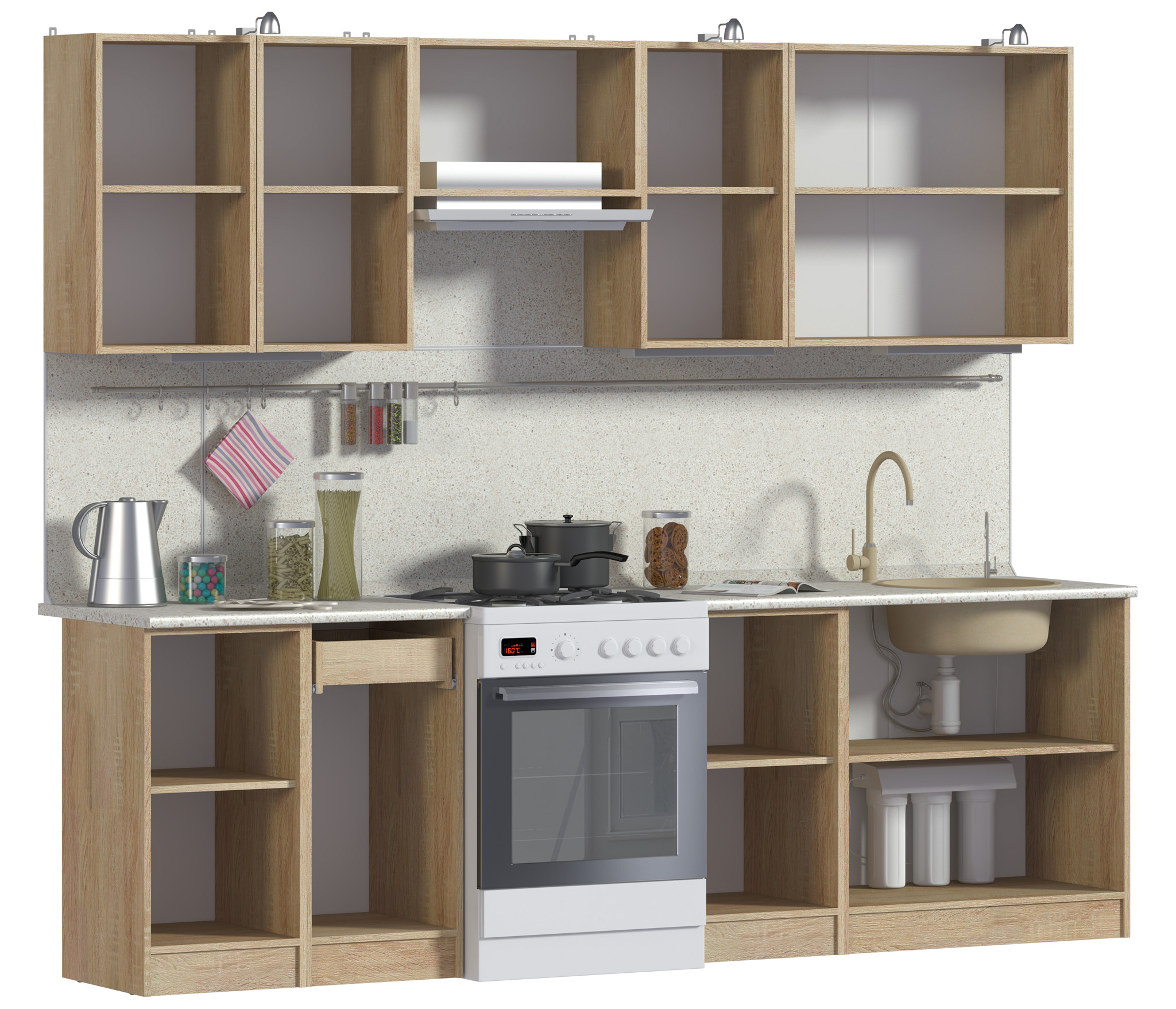 Смотрится довольно прилично, "Столплит" позиционирует данную кухню как бюджетную, отсюда вы не найдёте ящиков на 60см или под встраиваемую технику - ящики или 80 или 40 см . Внутри каждого ящика не более 1 одной полки.