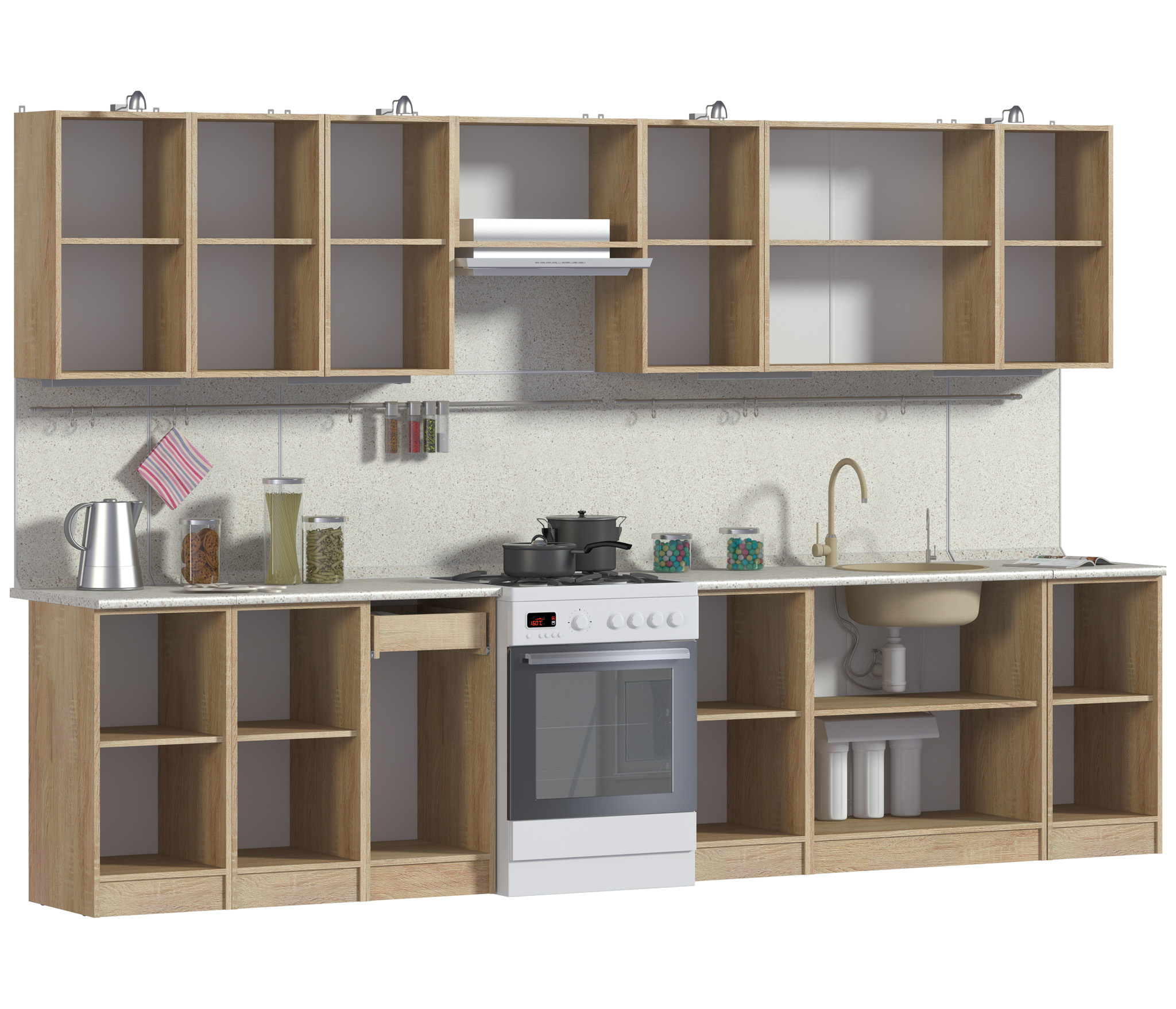 Глубина для столешницы: 60 см. Все столы и полки можно устанавливать в произвольном порядке. Дополнительно рекомендуем приобрести: Мойку, сушку, стеновую панель, столешницу, бортик, кромку, профили, уголки. Все необходимые комплектующие Вам поможет подобрать оператор.