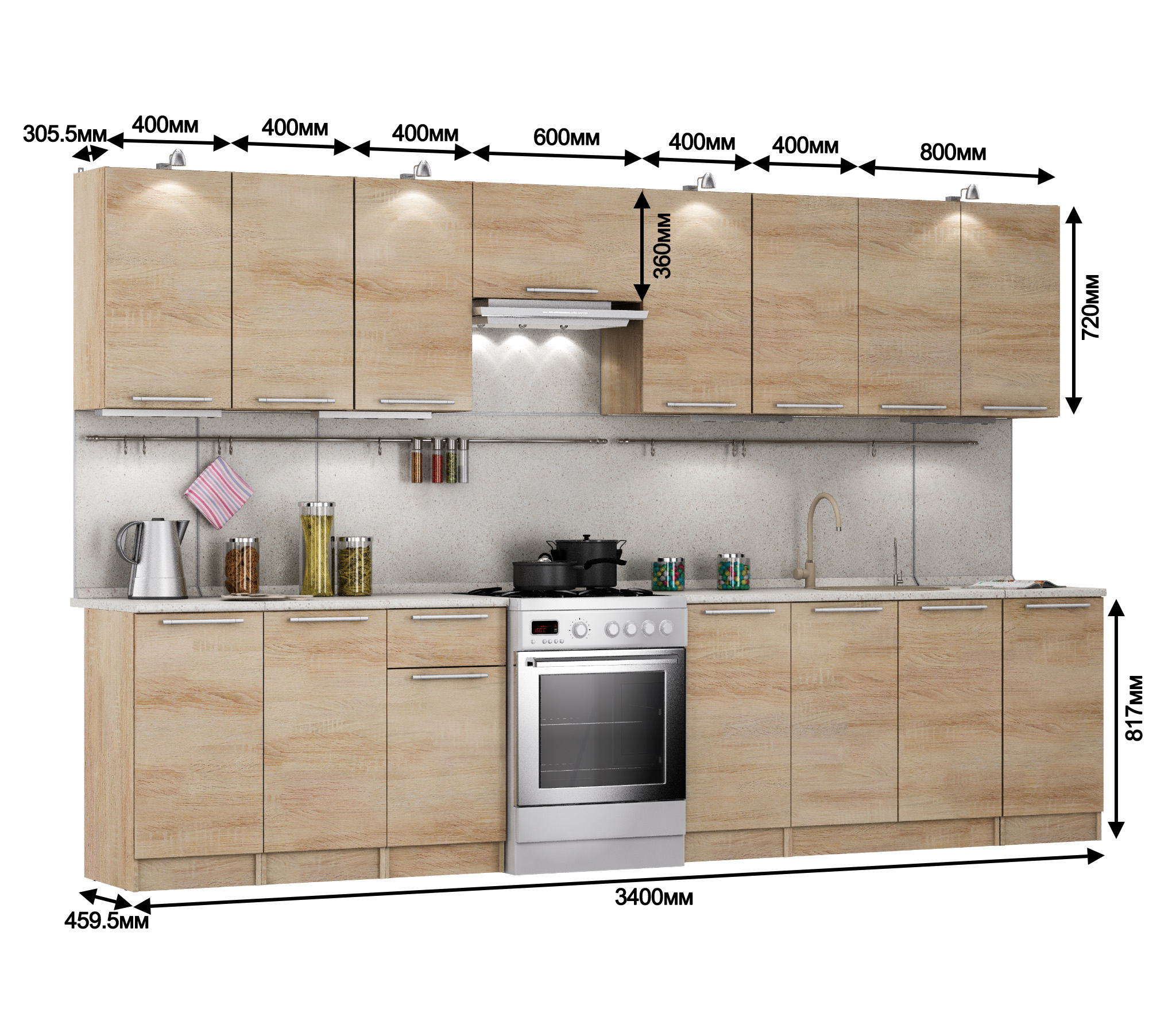 7 полок: 40 см, 40см, полка 40 см , 60см полка над вытяжкой, 80 см с двумя распашными фасадами, полка 40см, полка 40см. Глубина столов: 45 см. Высота полок 72 см.