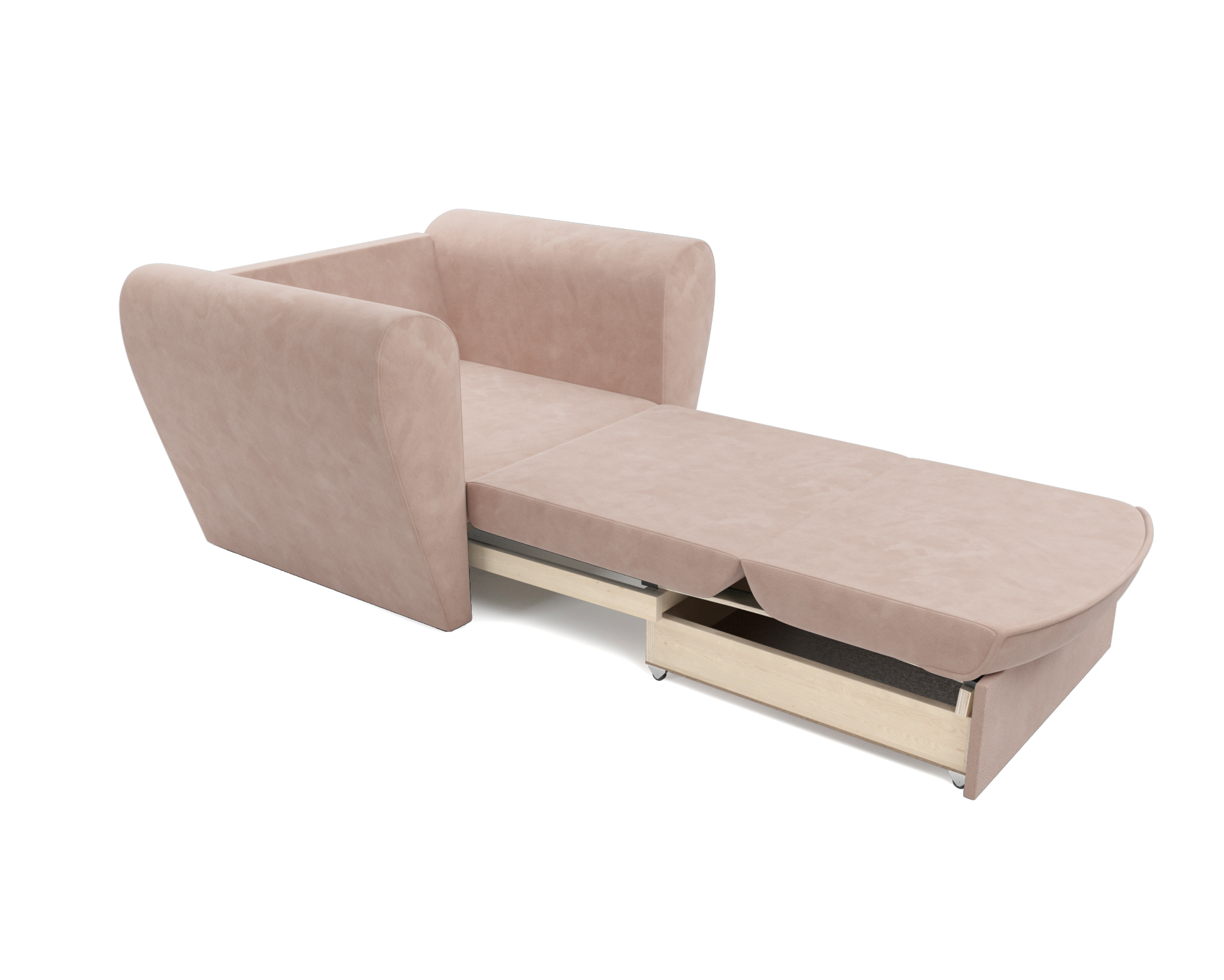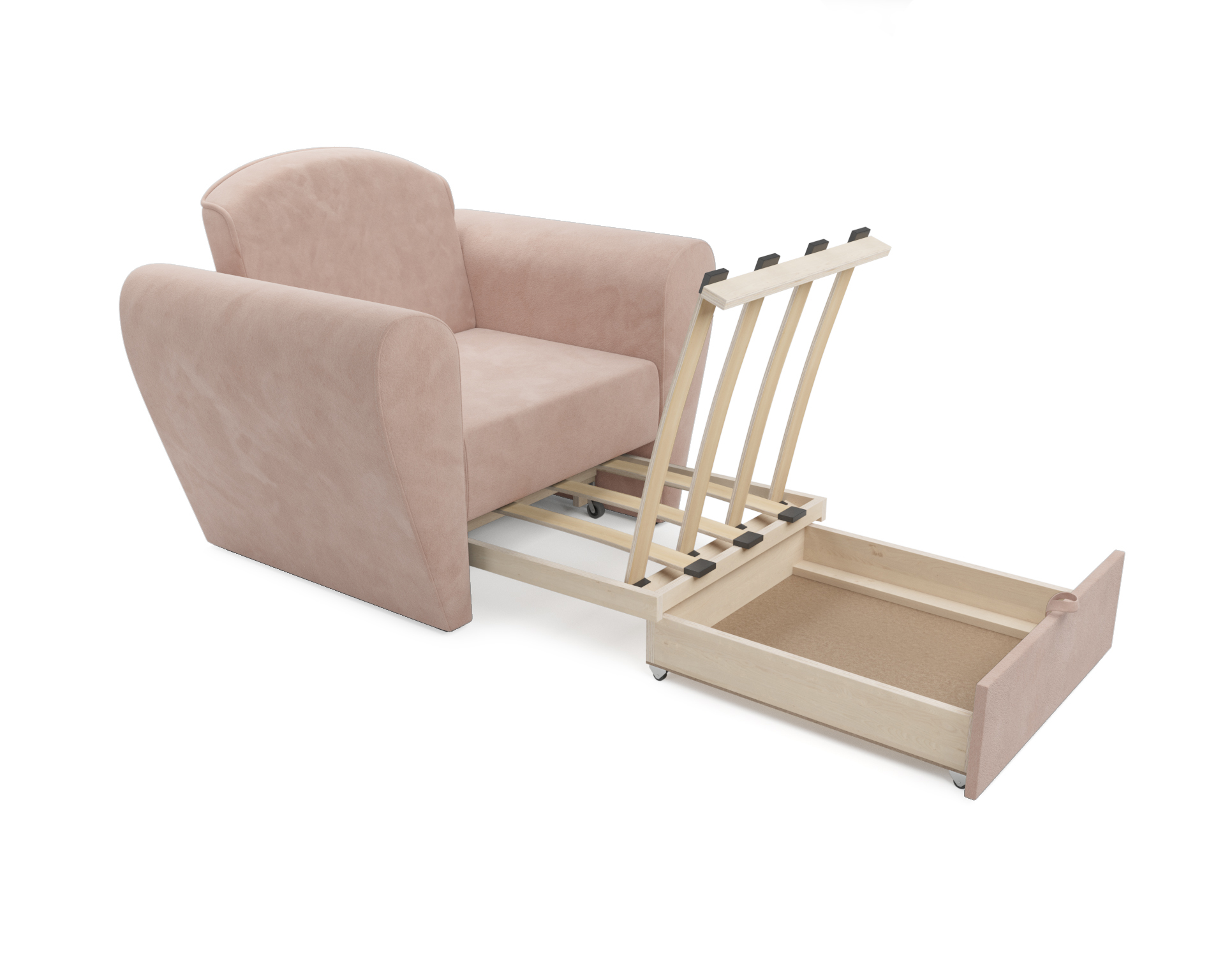 Выкатной механизм трансформации обеспечивает раскладывание спального места путем выдвижения нижней секции вперед. Кресло-кровать «Квартет» оборудован ящиком для белья, что также является безусловным плюсом, так как обеспечивает дополнительное место для хранения пастельных принадлежностей.