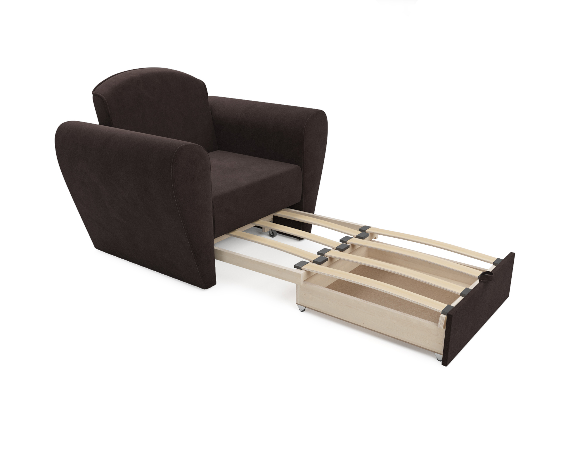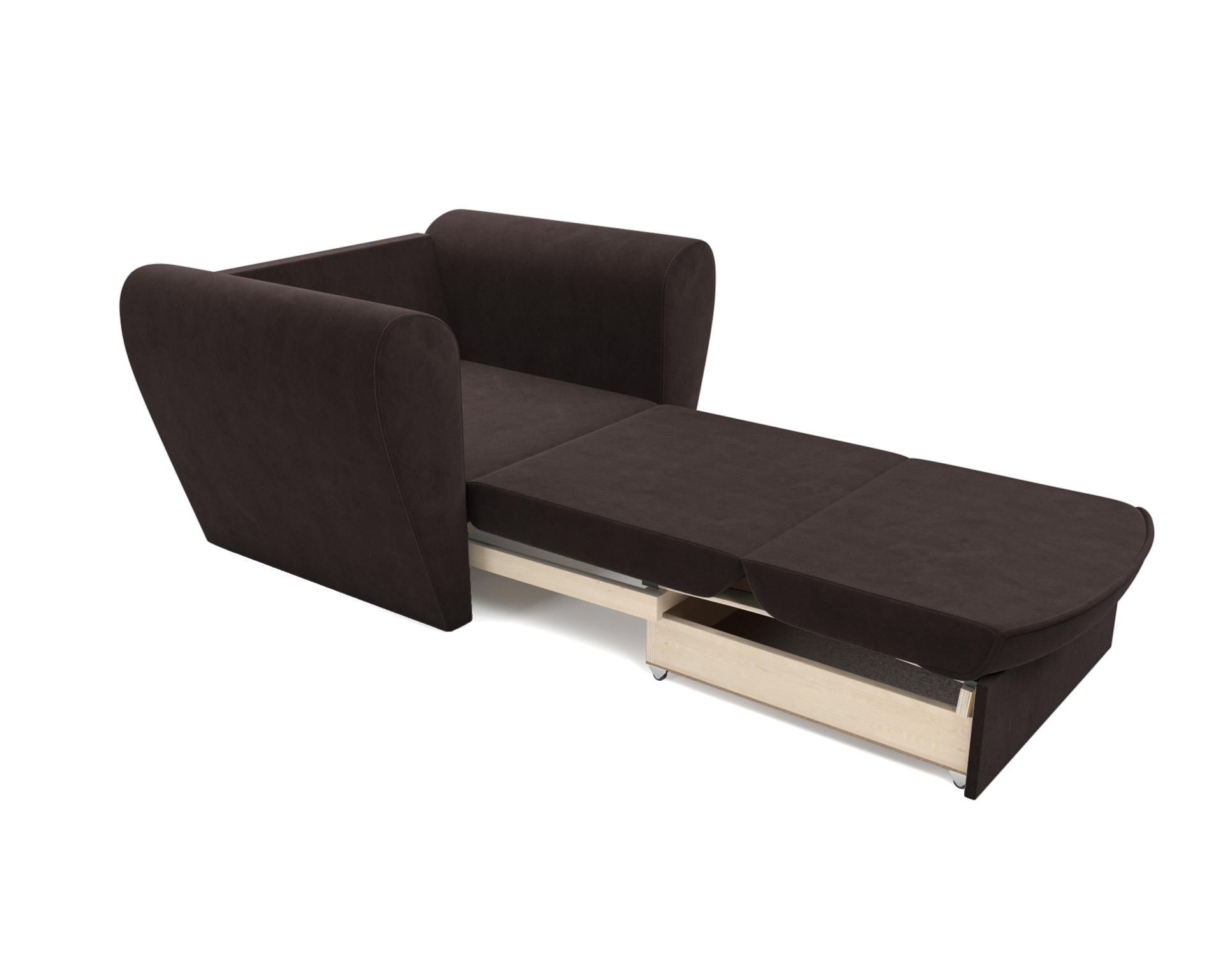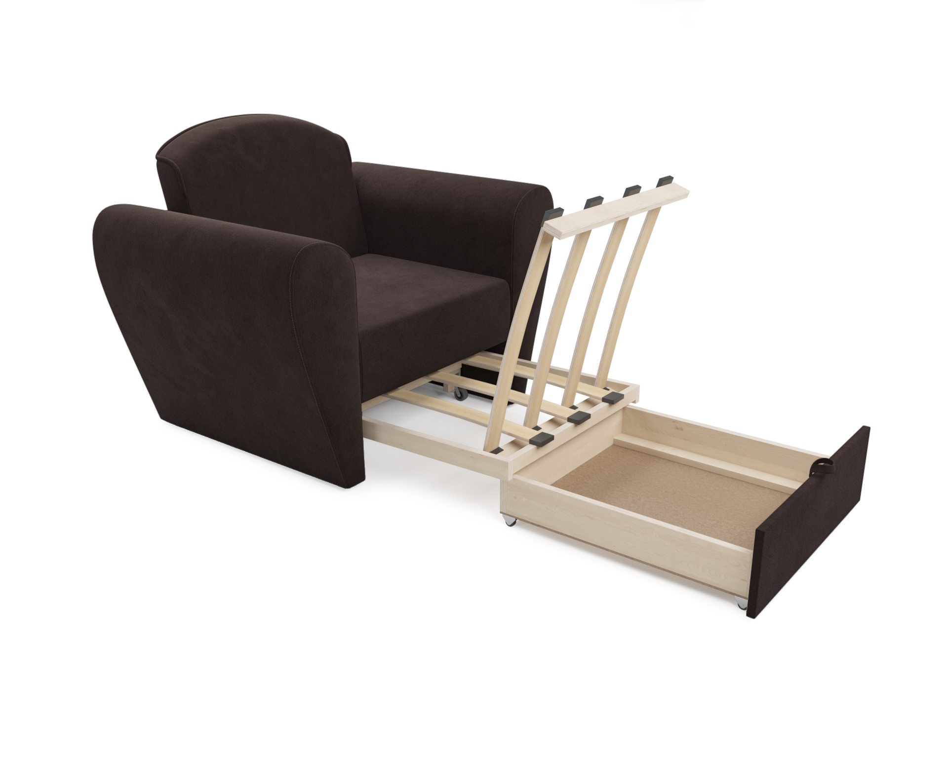 Выкатной механизм трансформации обеспечивает раскладывание спального места путем выдвижения нижней секции вперед. Кресло-кровать «Квартет» оборудован ящиком для белья, что также является безусловным плюсом, так как обеспечивает дополнительное место для хранения пастельных принадлежностей.
