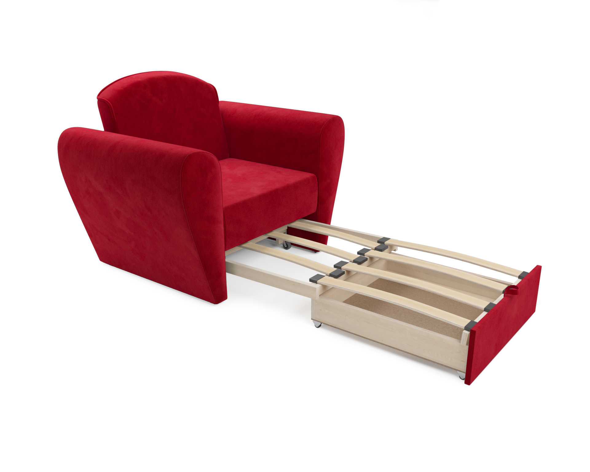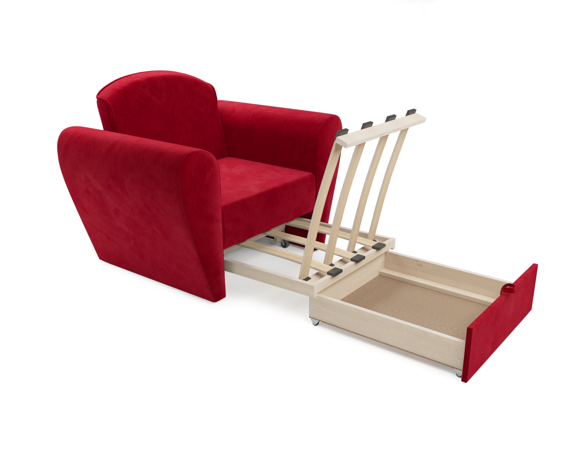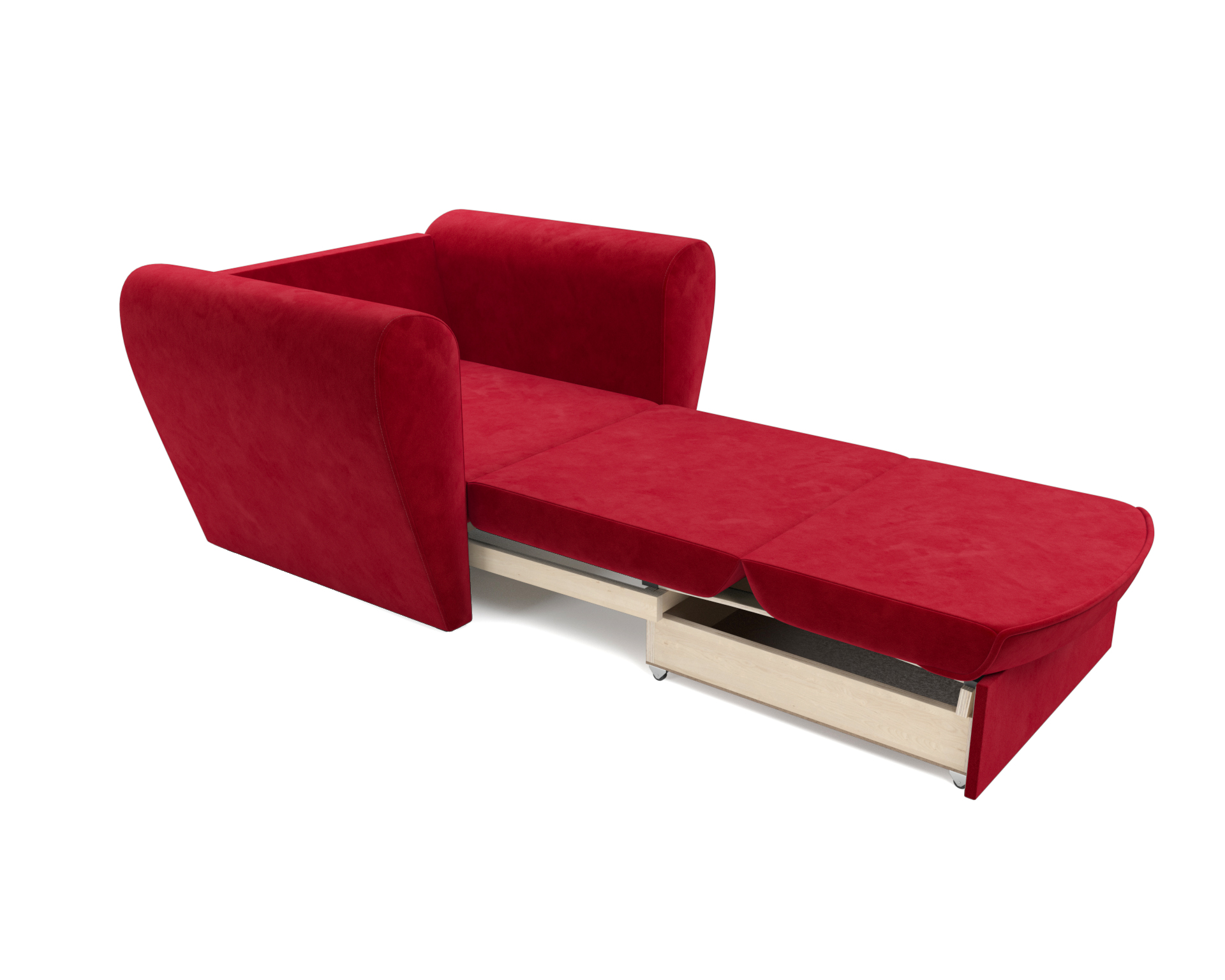 Выкатной механизм трансформации обеспечивает раскладывание спального места путем выдвижения нижней секции вперед. Кресло-кровать «Квартет» оборудован ящиком для белья, что также является безусловным плюсом, так как обеспечивает дополнительное место для хранения пастельных принадлежностей.