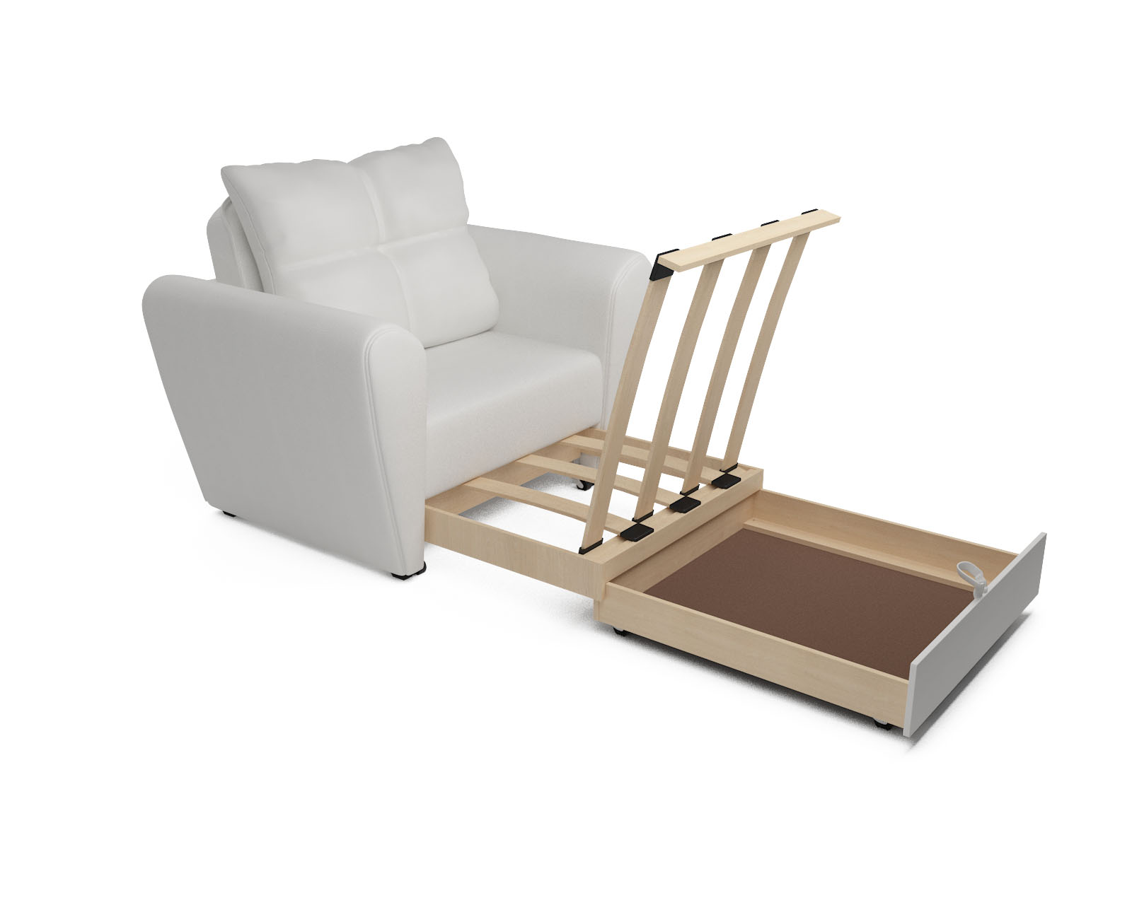 Выкатной механизм трансформации обеспечивает раскладывание спального места путем выдвижения нижней секции вперед. Кресло-кровать «Квартет» оборудован ящиком для белья, что также является безусловным плюсом, так как обеспечивает дополнительное место для хранения пастельных принадлежностей.