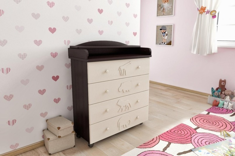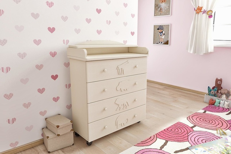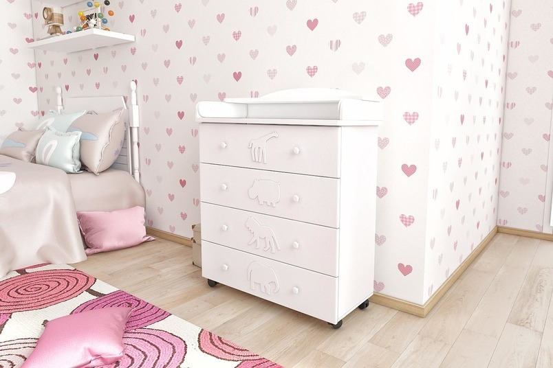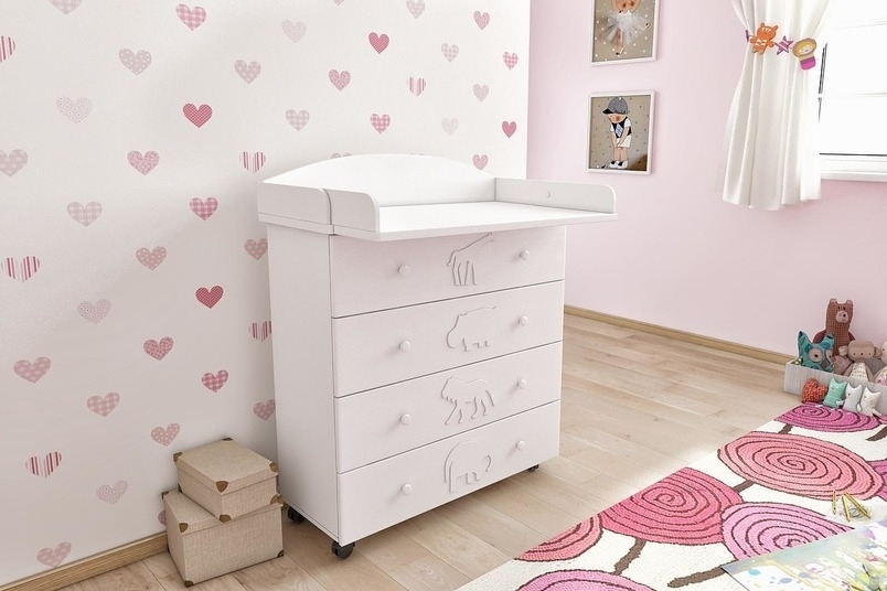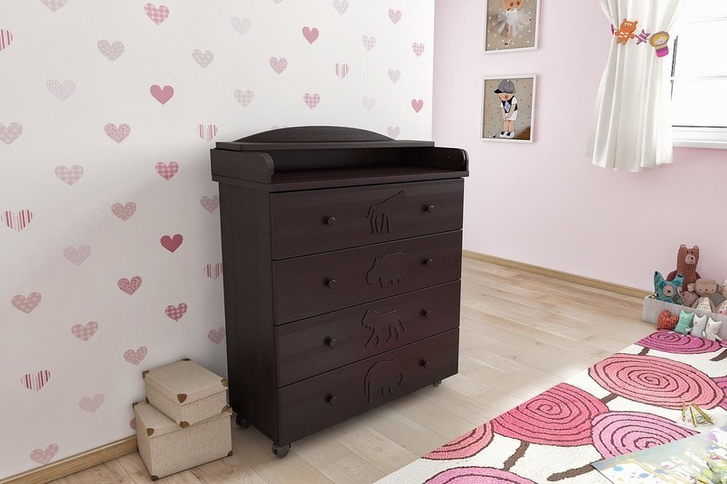 Сверху комода находится большая откидная доска для пеленания с защитными бортиками.Пеленальный столик легко раскладывается, увеличивая рабочую поверхность.