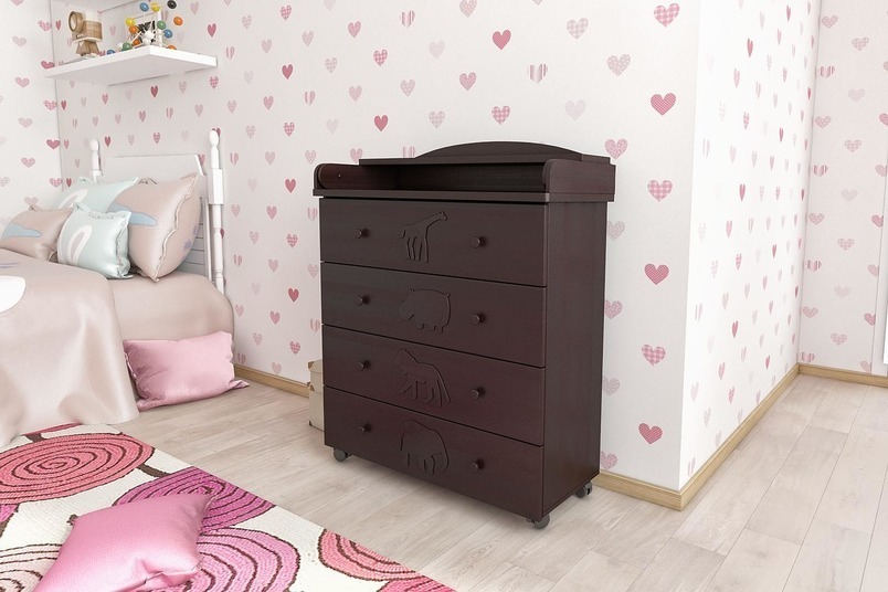 Сверху комода находится большая откидная доска для пеленания с защитными бортиками.Пеленальный столик легко раскладывается, увеличивая рабочую поверхность.