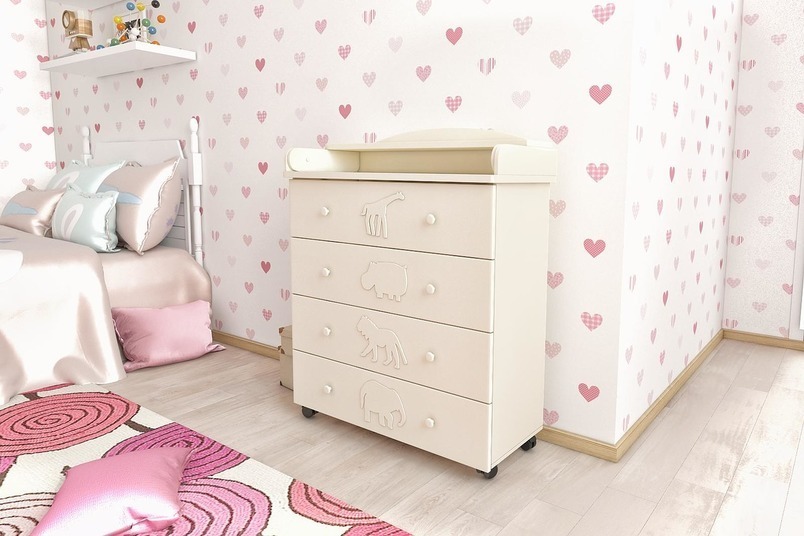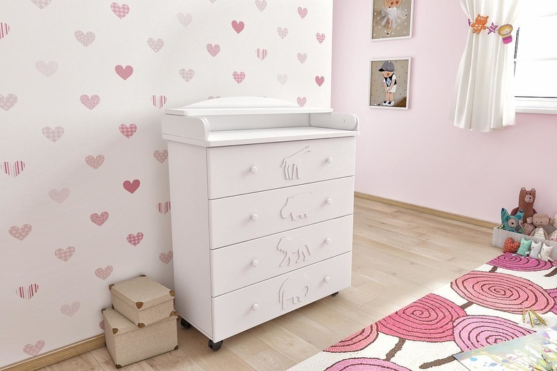 Сверху комода находится большая откидная доска для пеленания с защитными бортиками.Пеленальный столик легко раскладывается, увеличивая рабочую поверхность.