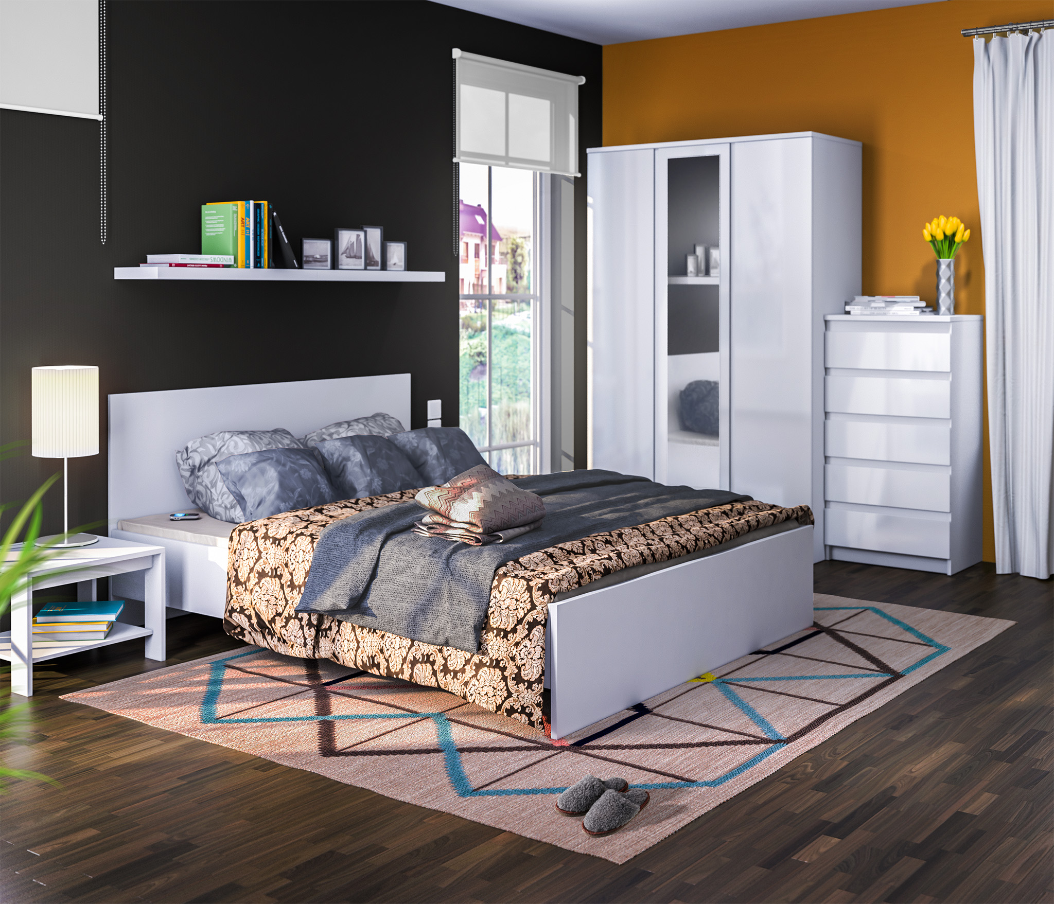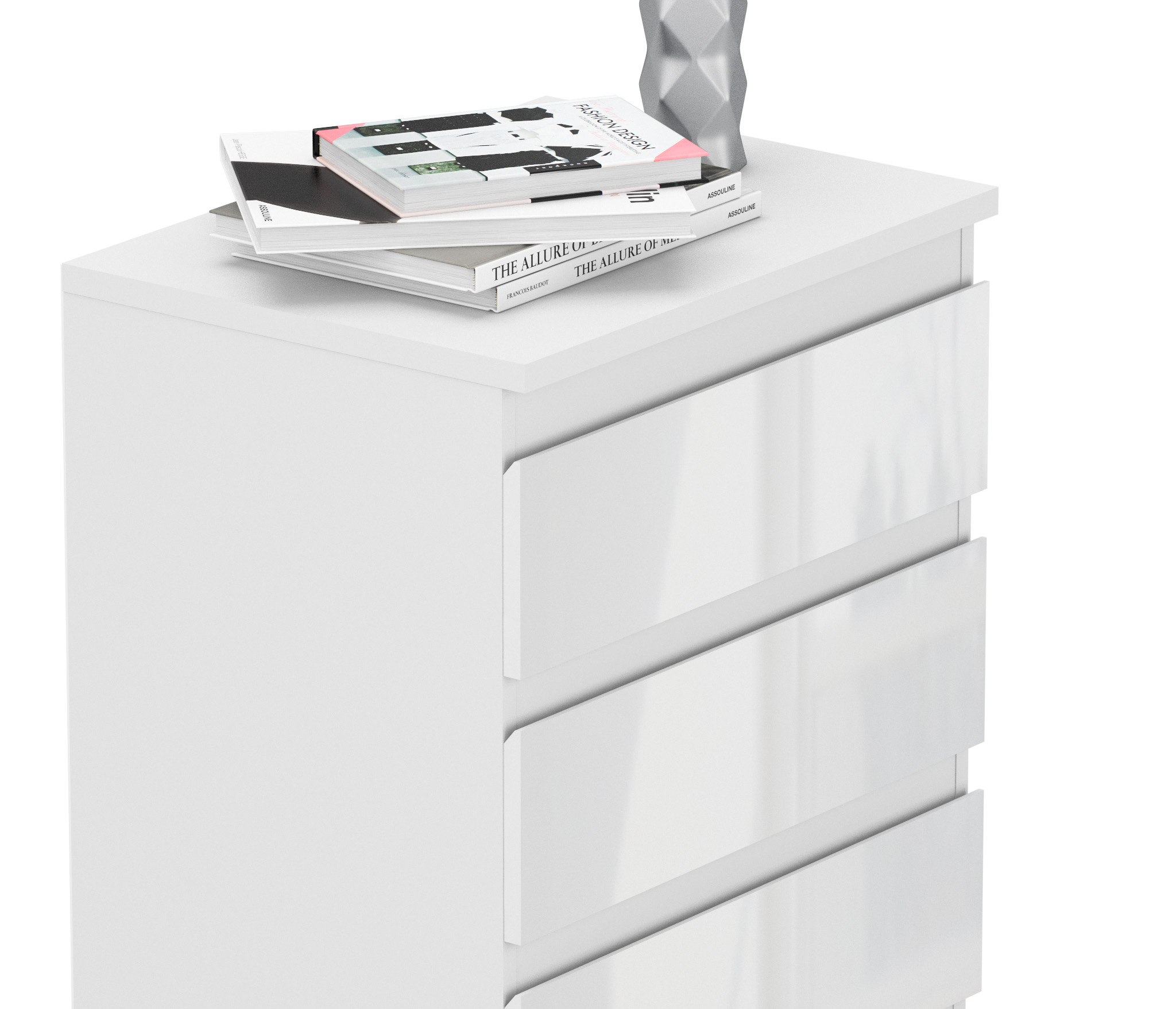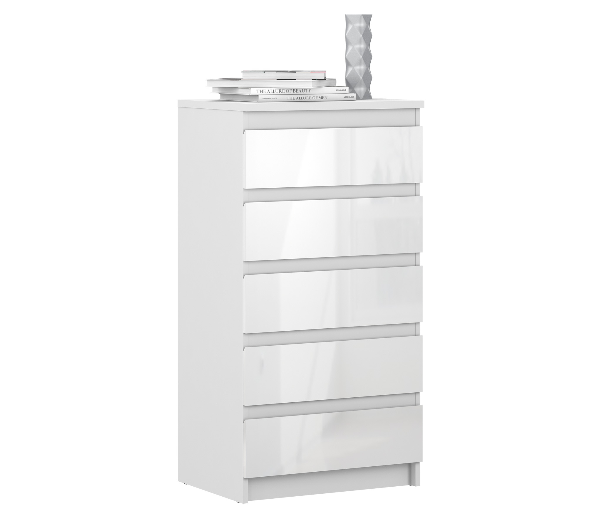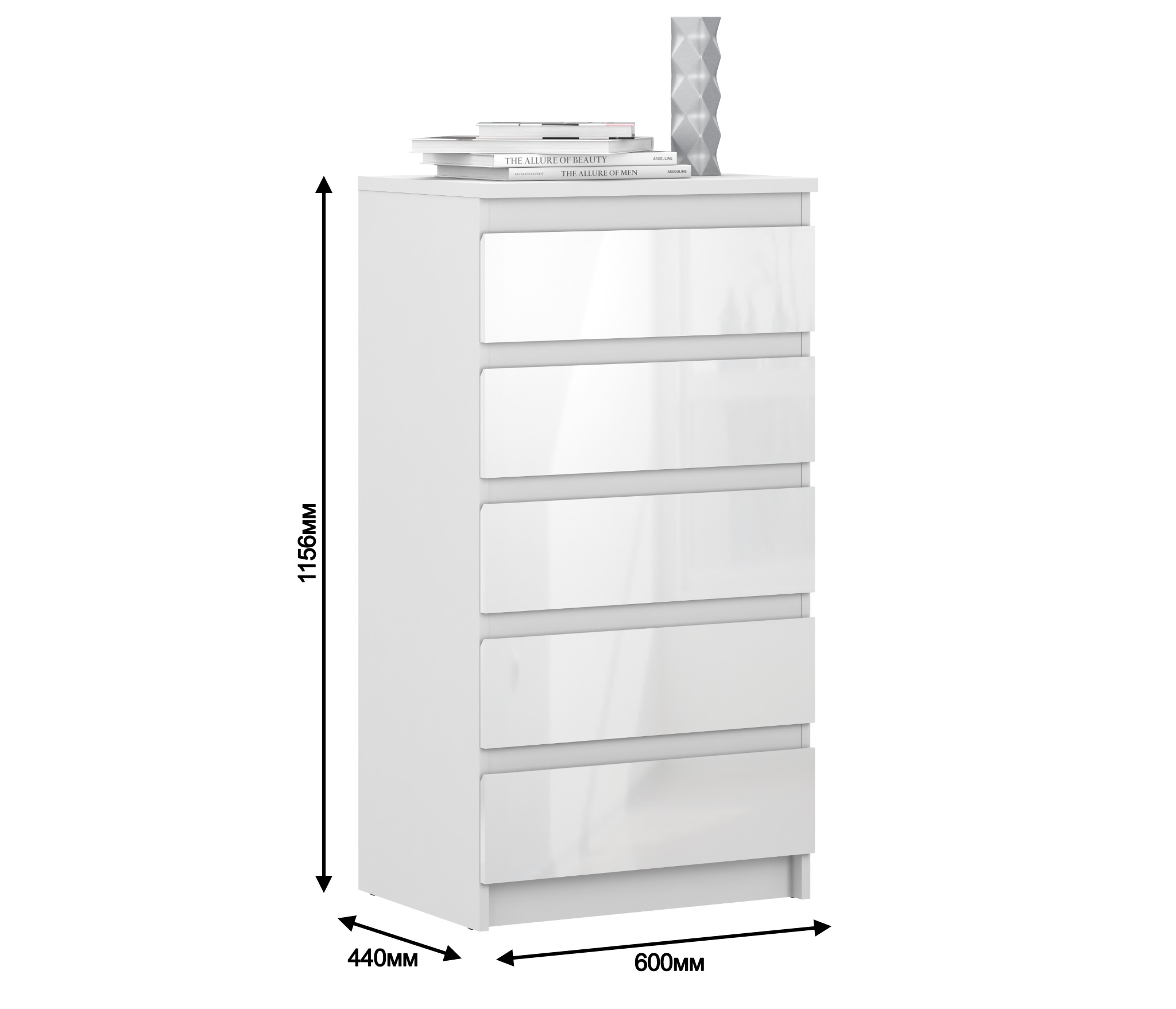 Несмотря на визуальную компактность, комод Медея довольно вместителен. Он оснащен пятью выдвижными ящиками. Механизмы ящиков прочные и имеют приличный ресурс. У ящиков нет навесных или прикручивающихся ручек. Белый цвет, минималистичный дизайн придают комоду легкость.