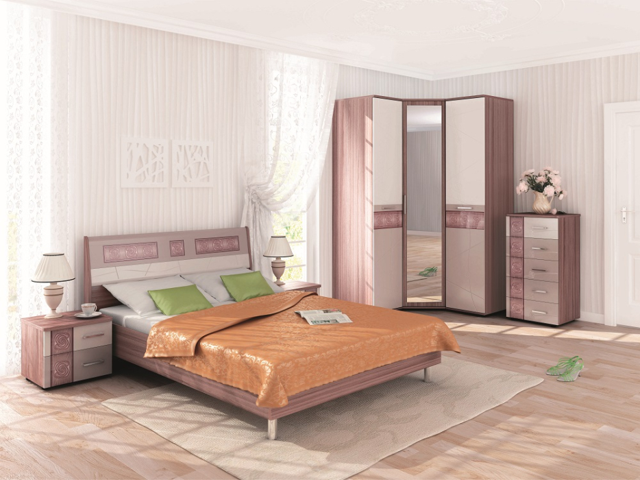 Комплект мебели для спали выполнен в едином стиле. Все модули независимые, их можно расположить в любом порядке. При необходимости вы может дополнить набор любым элементом из серии. И будьте уверены — мебель из одной серии идеально подходит друг к другу по цвету, размера и фактуре.Обратите внимание! Для получения гарантийного обслуживания мебели фабрики «Витра» необходимо обязательно сохранять гарантийный талон и сборочный чертеж до окончания гарантийного срока на приобретенную мебель (срок указан в гарантийном талоне). Комплект включает в себя: — две прикроватные тумбочки с двумя выдвижными ящиками (высота х ширина х глубина): 420 х 470 х 420 мм; — кровать с ортопедическим основанием на металлокаркасе, с декоративным изголовьем, утолщенной по высоте спинкой (высота х ширина х глубина): 950 х 1710 х 2120 мм, размер спального места - 1600 х 2000 мм. Важно! Матрас в стоимость кровати не входит - приобретается отдельно; — угловой шкаф для одежды с зеркальной дверью со штангой и полками (высота х ширина х глубина): 2250 х 890 х 890 мм; — два узких шкафа - пенала с полками (высота х ширина х глубина): 2250 х 450 х 570 мм; — комод с пятью выдвижными ящиками (высота х ширина х глубина): 1070 х 540 х 450 мм.Материал корпуса — ЛДСП 16 и 22 мм с использованием кромки ПВХ 0,4 и 2 ммМатериал фасадов — МДФ 16 мм, стеклянные вставки с рисунком и сложная фрезеровкаОсобенности — регулируемые по высоте ножки, во всех шкафах используются петли с доводчикамиФорма поставки — в разобранном видеСтрана производства — РоссияГарантия — 5 лет