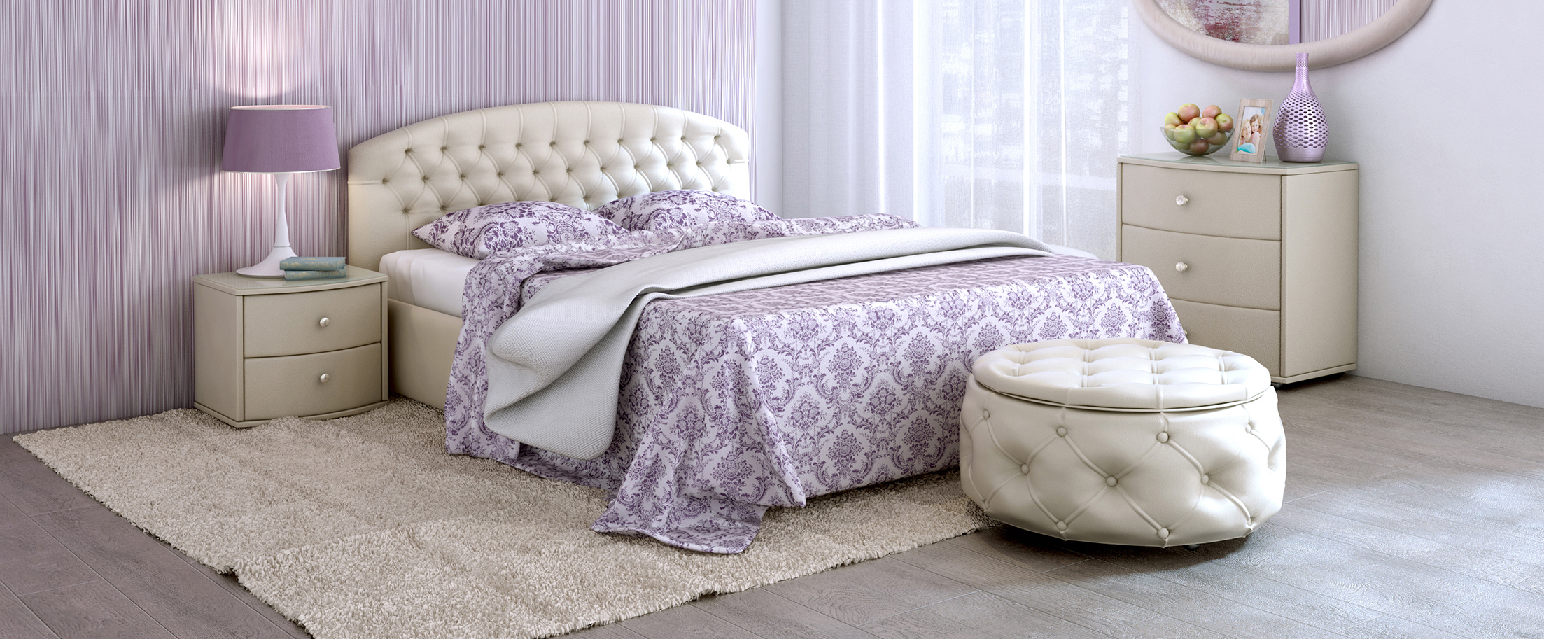 Кровать имеет рельефную мягкую спинку с неглубокими стяжками, которые придают особую изысканность изголовью. Обивка изголовья и весь периметр кровати выполнен из мебельной ткани – велюр. Это уникальный материал, который получается за счет сплетения пяти волокон одновременно. Дорогая ткань велюр придает кровати более величественный благородный вид. Ткань износостойкая, легко чиститься от загрязнений (влажной тряпочкой, любыми средствами, кроме средств с растворителями), практичная, эластичная, устойчивая к ультрафиолету.