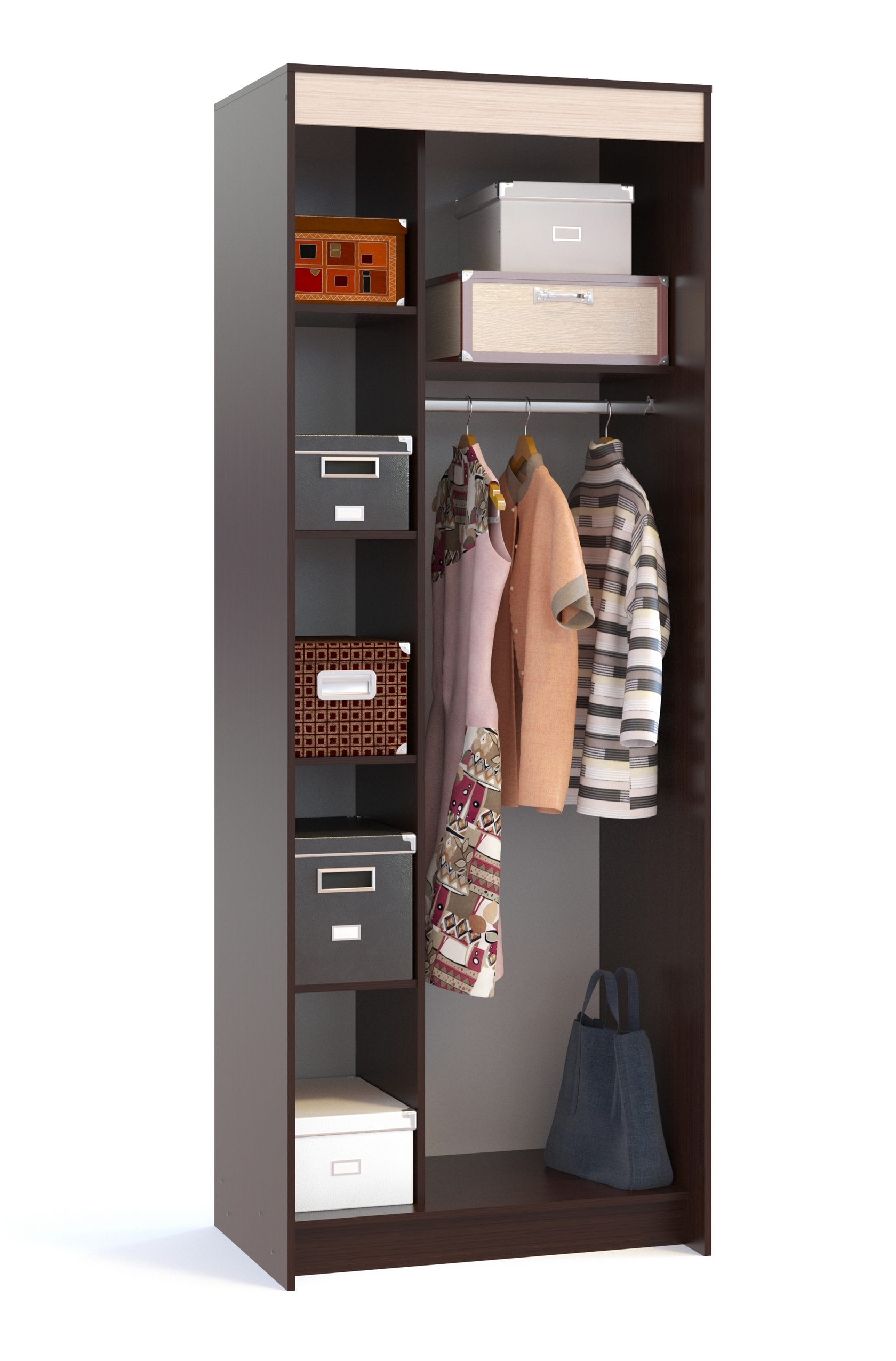Модель имеет штангу для одежды, несъемную полку для шляп и четыре съемные полки.
