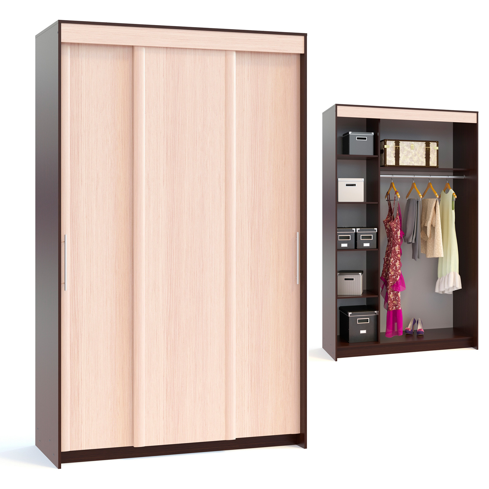 Шкаф оснащен штангой для одежды, несъемной полкой для шляп и 4-мя съемными полками. Модель имеет удобные в применении дверцы купе.