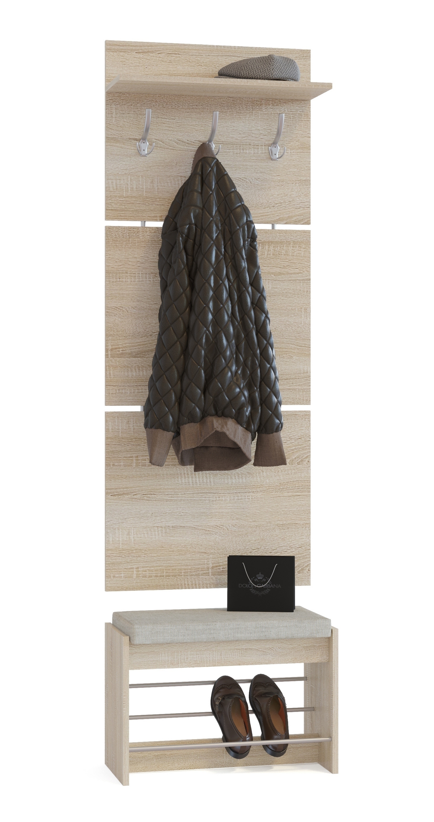 Вешалка состоит из трех панелей, соединенных металлическими вставками. Полка, закрепленная над крючками для одежды, предназначена специально для головных уборов и зонтов. Максимальная нагрузка на полку составляет 5 кг.